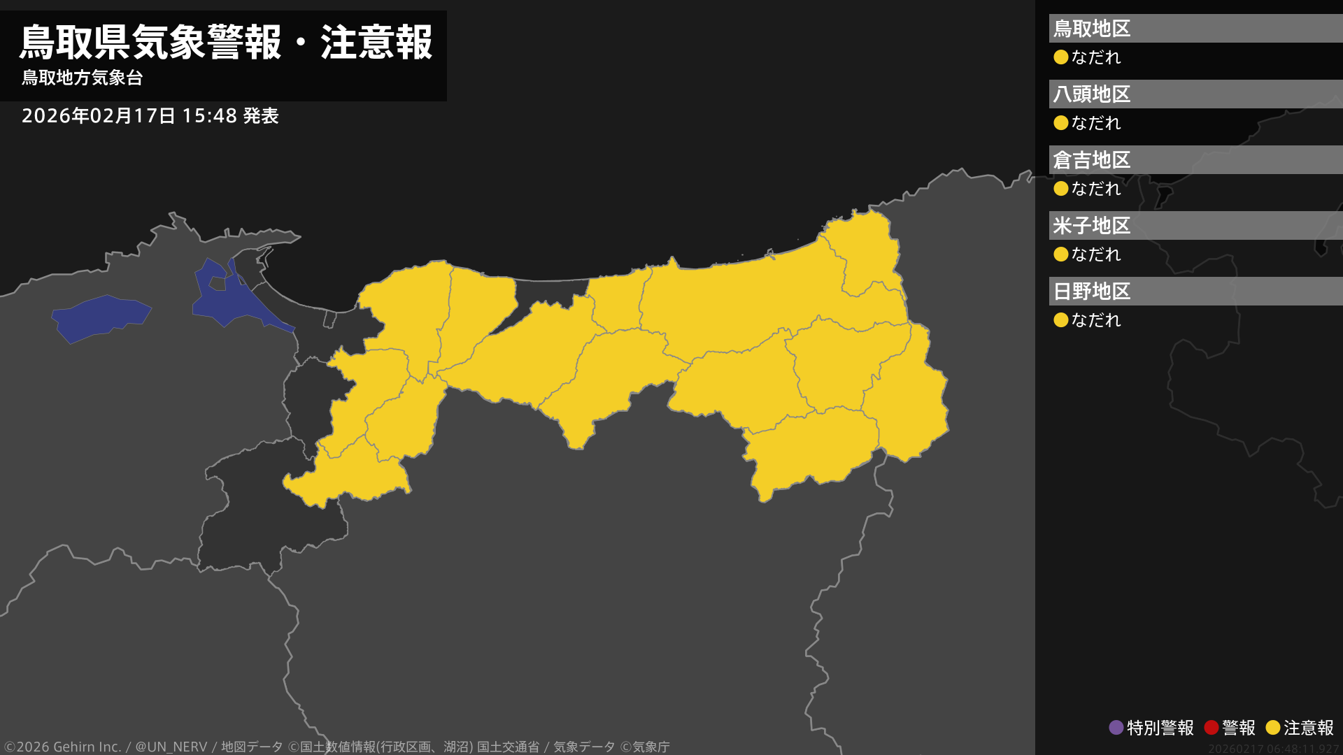 【鳥取県 気象警報・注意報 2026年02月17日 15:48】