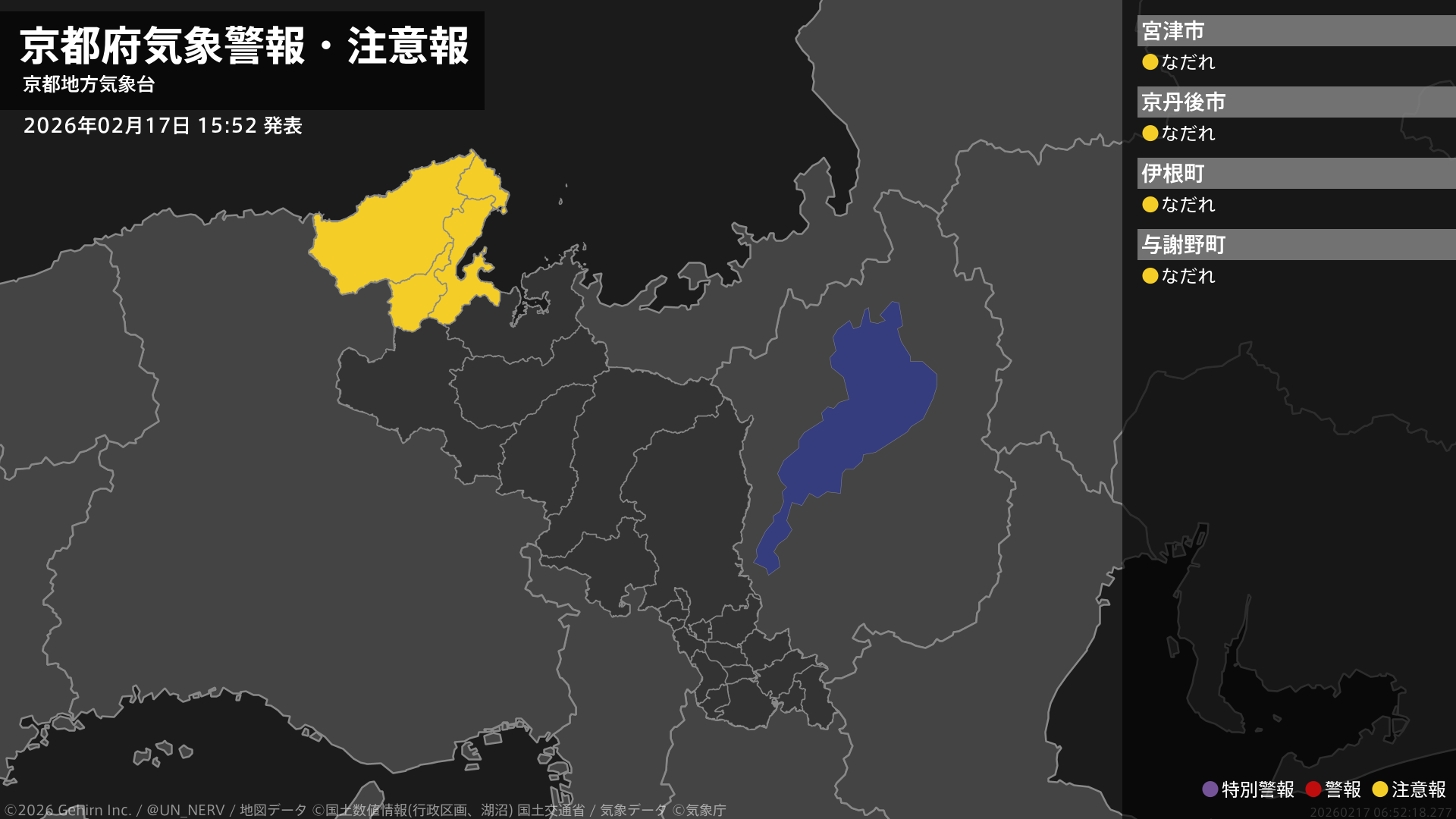 【京都府 気象警報・注意報 2026年02月17日 15:52】