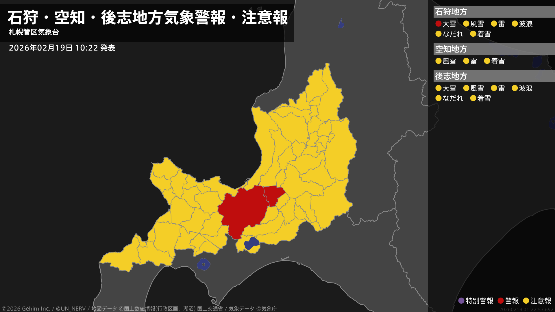 【石狩・空知・後志地方 気象警報・注意報 2026年02月19日 10:22】石狩地方では、19日昼過ぎまで大雪に警戒してください。#気象警報注意報 #石狩地方 #空知地方 #後志地方