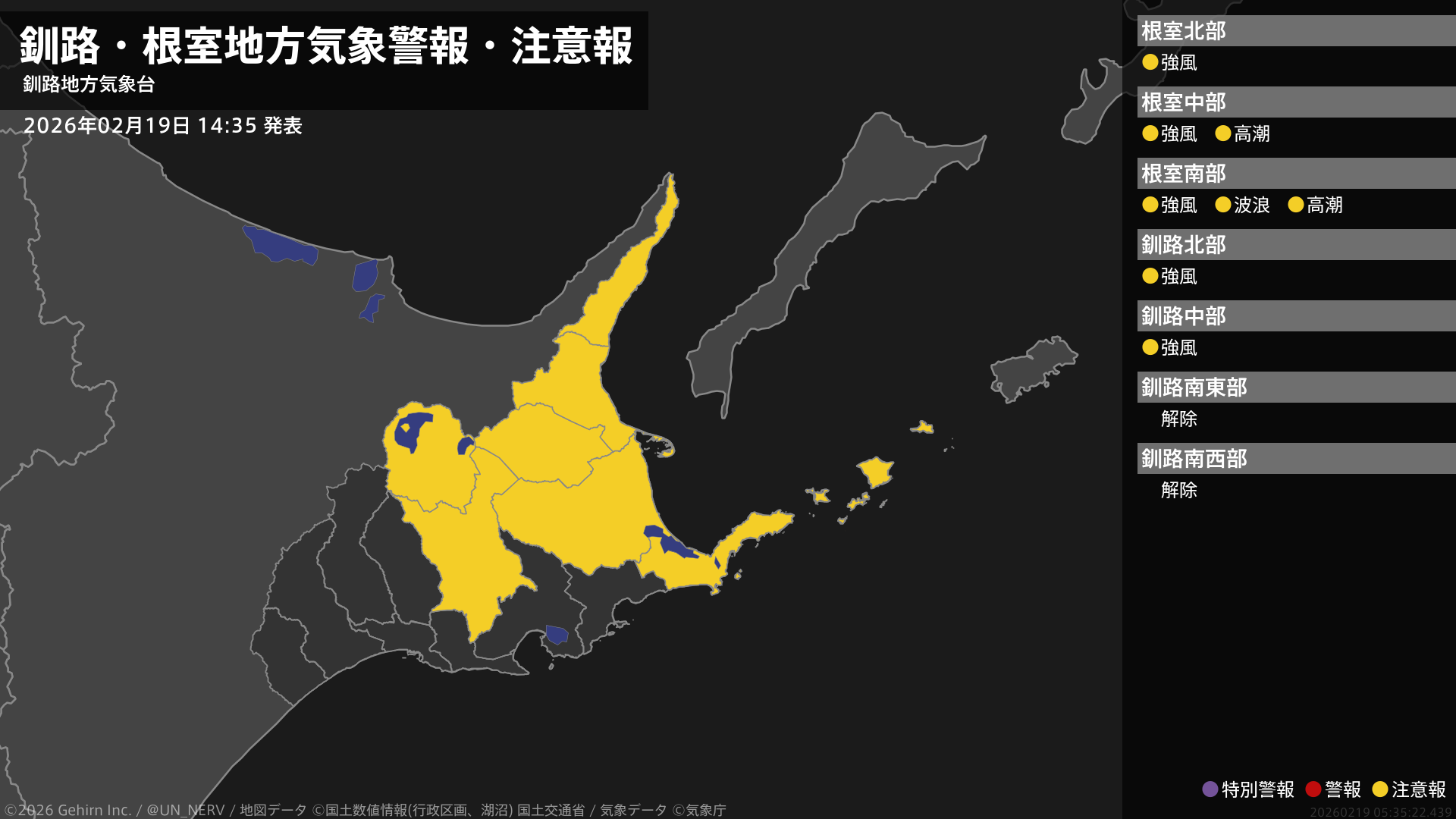 【釧路・根室地方 気象警報・注意報 2026年02月19日 14:35】根室、釧路地方では、20日明け方まで強風に注意してください。根室地方では、19日夕方から20日明け方まで高波に、19日夕方まで高潮に注意してください。#気象警報注意報 #根室地方 #釧路地方