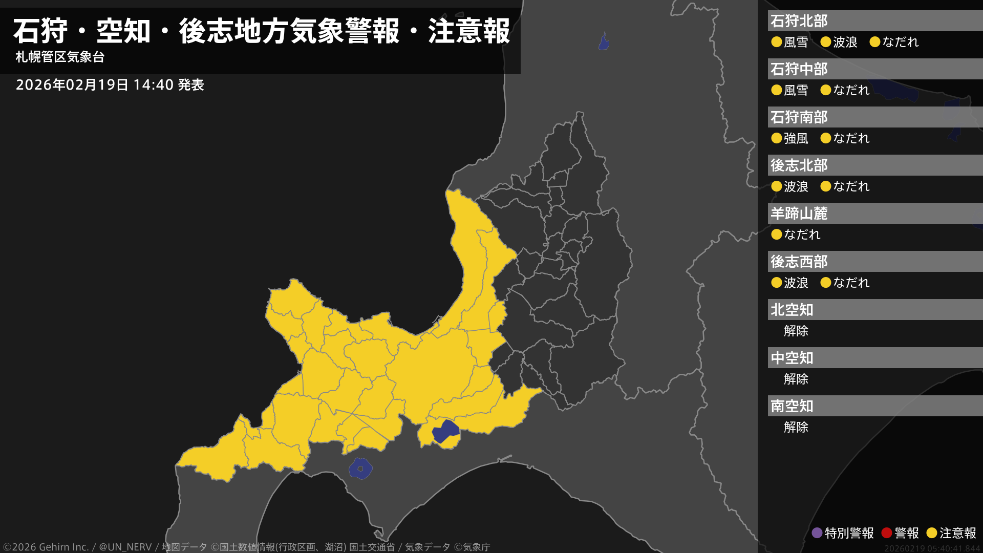 【石狩・空知・後志地方 気象警報・注意報 2026年02月19日 14:40】石狩地方では、19日夜のはじめ頃まで強風や風雪に注意してください。石狩、後志地方では、19日夜のはじめ頃まで高波に、20日までなだれに注意してください。#気象警報注意報 #石狩地方 #空知地方 #後志地方