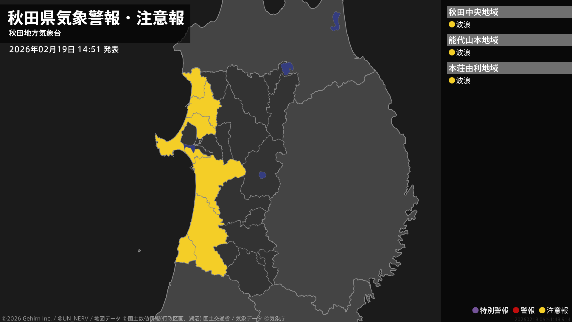 【秋田県 気象警報・注意報 2026年02月19日 14:51】沿岸では、19日夜遅くまで高波に注意してください。#気象警報注意報 #秋田県