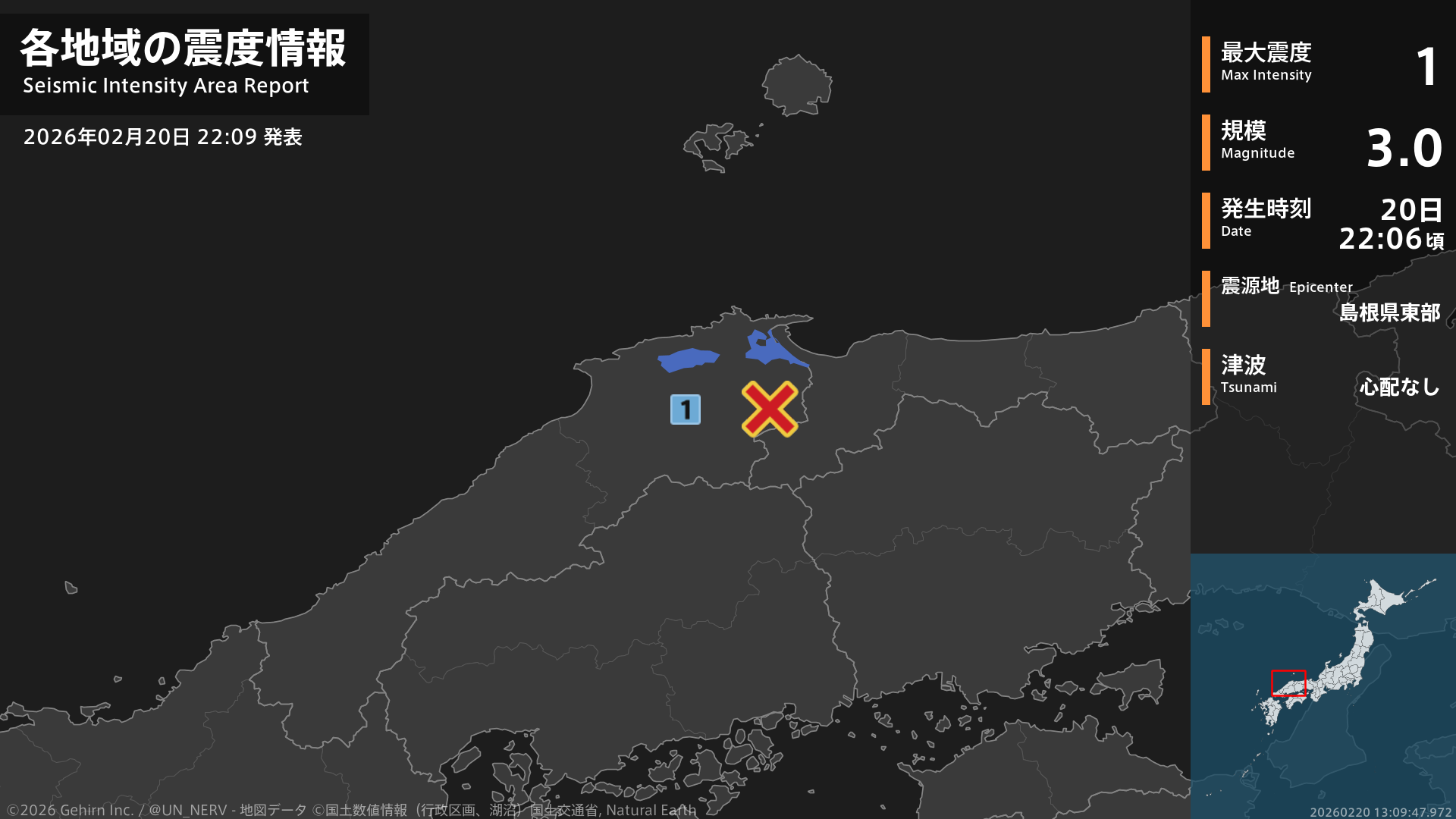 22時6分頃、島根県東部を震源とする地震がありました。震源の深さは約10km、地震の規模はM3.0、最大震度1を島根県で観測しています。この地震による津波の心配はありません。