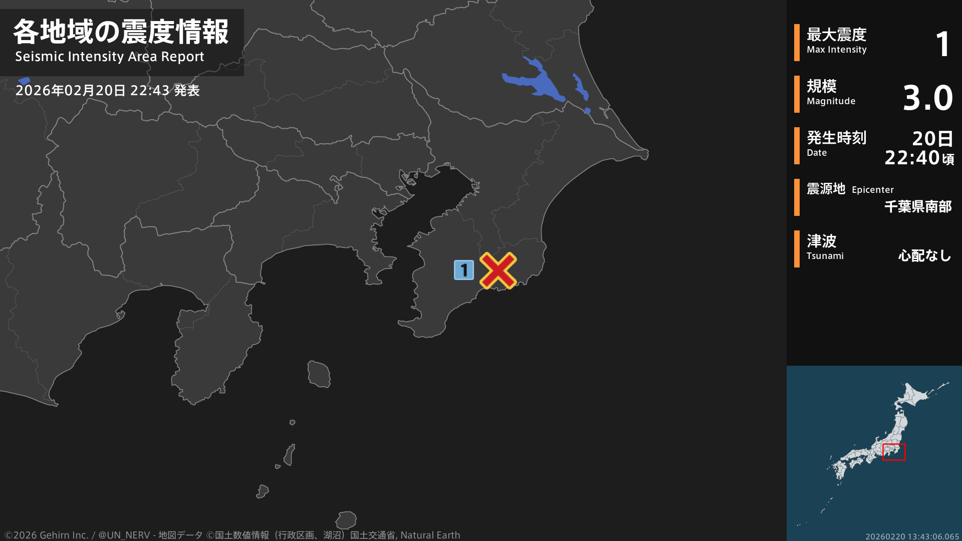 22時40分頃、千葉県南部を震源とする地震がありました。震源の深さは約30km、地震の規模はM3.0、最大震度1を千葉県で観測しています。この地震による津波の心配はありません。
