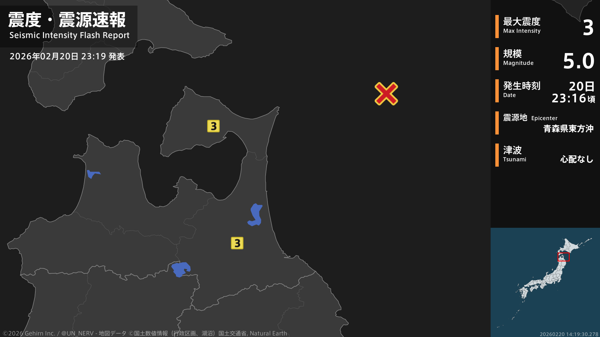 23時16分頃、青森県東方沖を震源とする地震がありました。震源の深さは約60km、地震の規模はM5.0、最大震度3を青森県で観測しています。この地震による津波の心配はありません。