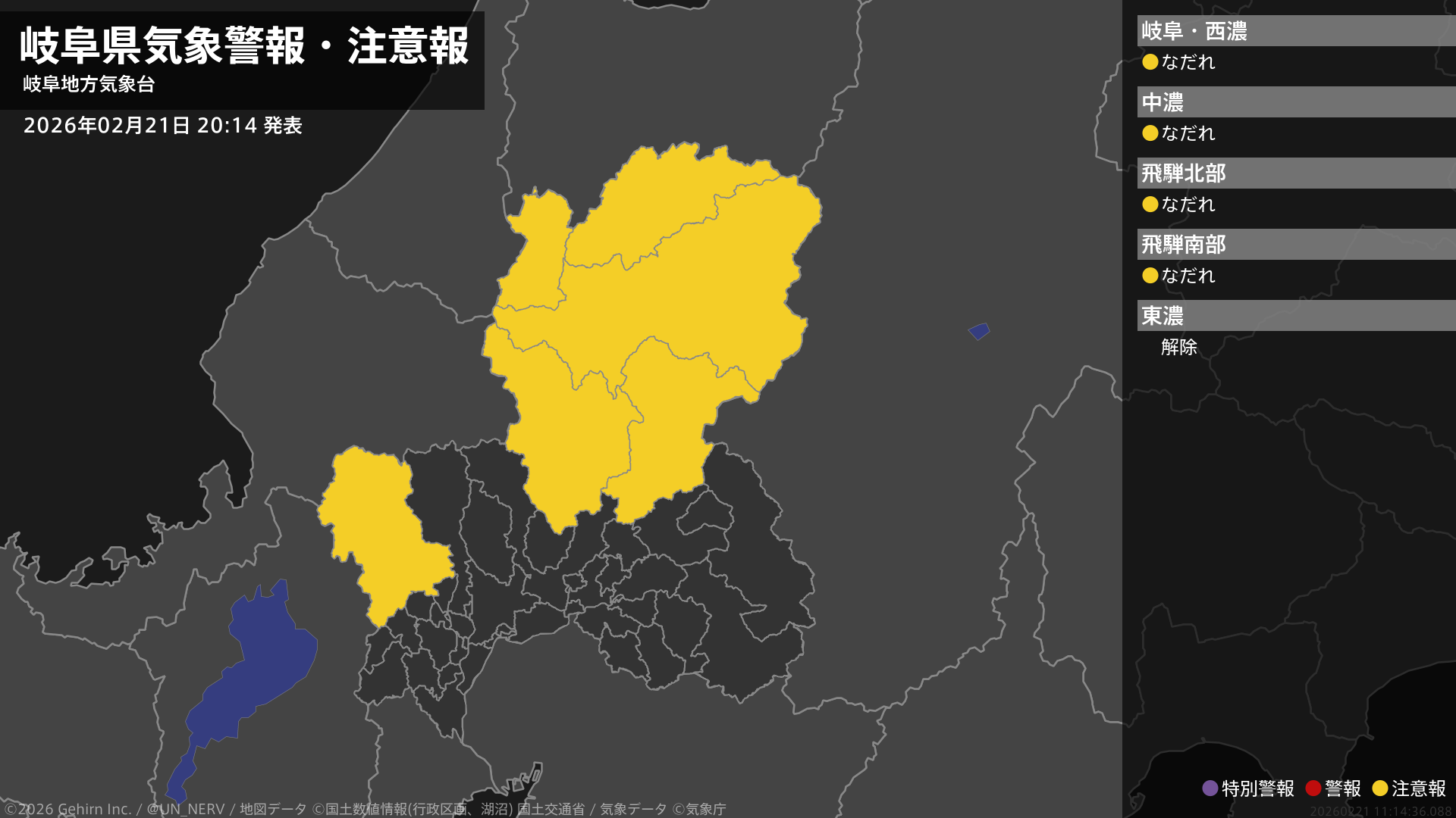 【岐阜県 気象警報・注意報 2026年02月21日 20:14】