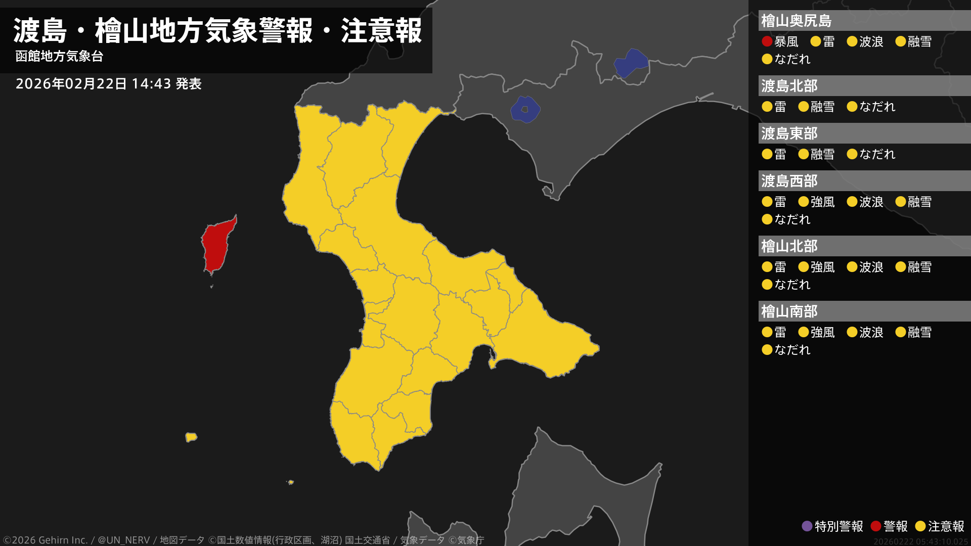 【渡島・檜山地方 気象警報・注意報 2026年02月22日 14:43】檜山地方では、22日夜のはじめ頃から23日未明まで暴風に警戒してください。#気象警報注意報 #渡島地方 #檜山地方