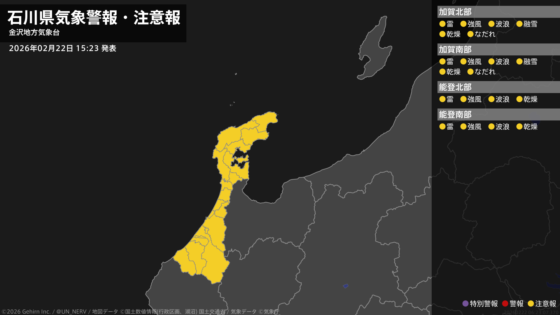 【石川県 気象警報・注意報 2026年02月22日 15:23】石川県では、強風や高波、竜巻などの激しい突風、落雷と、空気の乾燥した状態が続くため火の取り扱いに注意してください。加賀では、融雪による土砂災害やなだれに注意してください。#気象警報注意報 #石川県