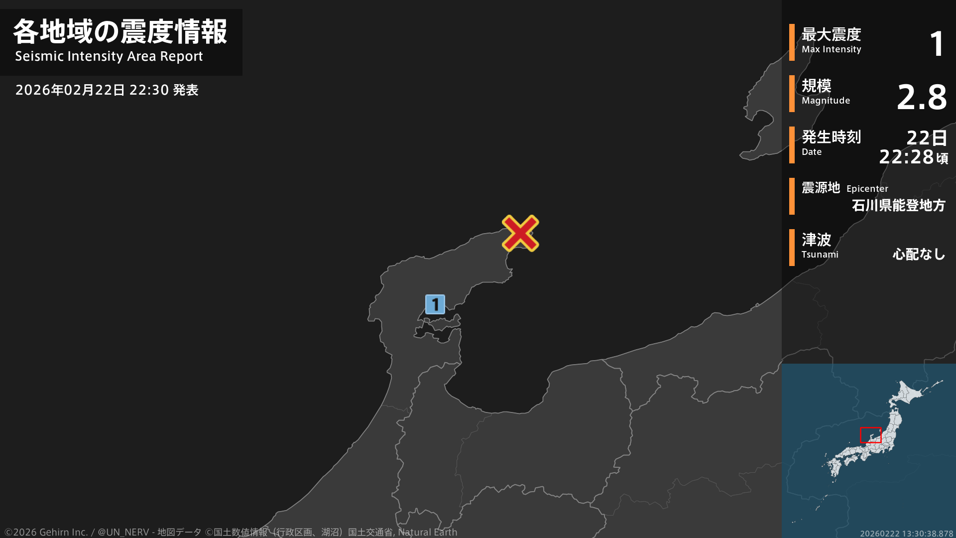 【地震情報 2026年2月22日】22時28分頃、石川県能登地方を震源とする地震がありました。震源の深さは約10km、地震の規模はM2.8、最大震度1を石川県で観測しています。この地震による津波の心配はありません。#地震 #石川県