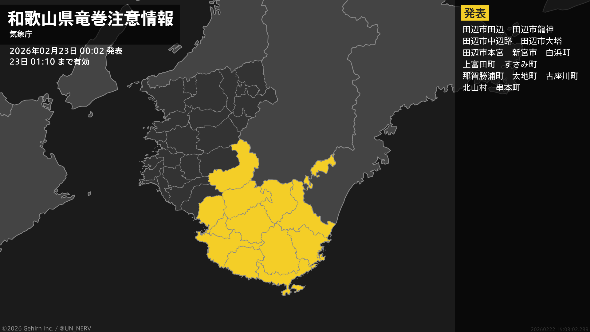 【和歌山県 竜巻注意情報】和歌山県は、竜巻などの激しい突風が発生しやすい気象状況になっています。頑丈な建物内に移動するなど安全確保に努めてください。この情報は23日01:10まで有効です。#竜巻注意情報 #和歌山県