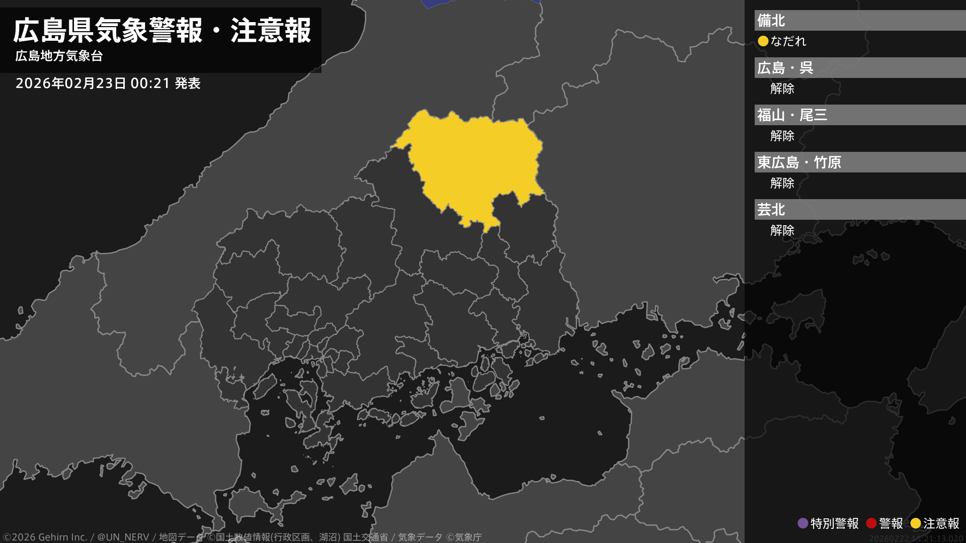 【広島県 気象警報・注意報 2026年02月23日 00:21】北部では、23日までなだれに注意してください。#気象警報注意報 #広島県