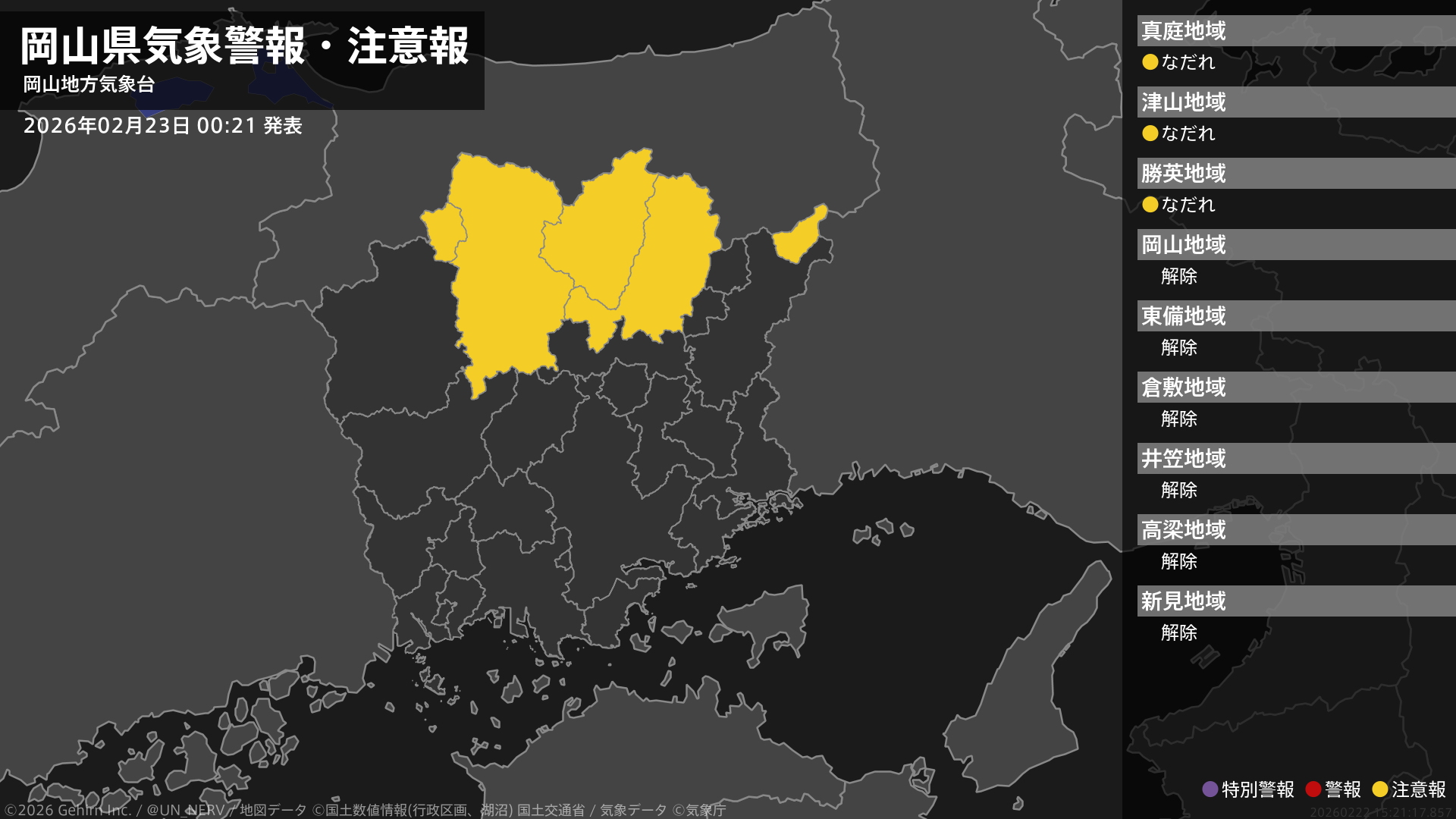 【岡山県 気象警報・注意報 2026年02月23日 00:21】北部では、24日までなだれに注意してください。#気象警報注意報 #岡山県
