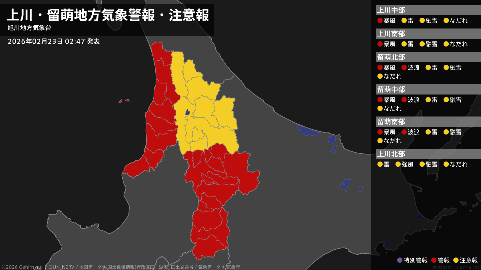 【上川・留萌地方 気象警報・注意報 2026年02月23日 02:47】