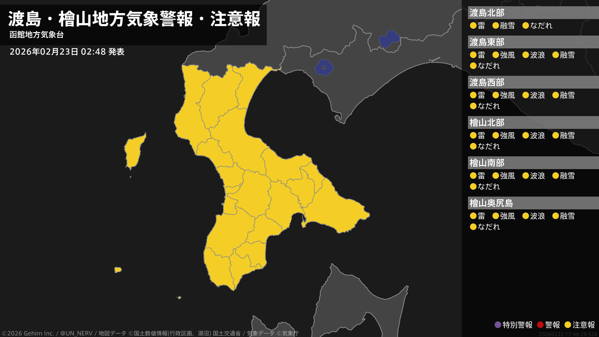 【渡島・檜山地方 気象警報・注意報 2026年02月23日 02:48】