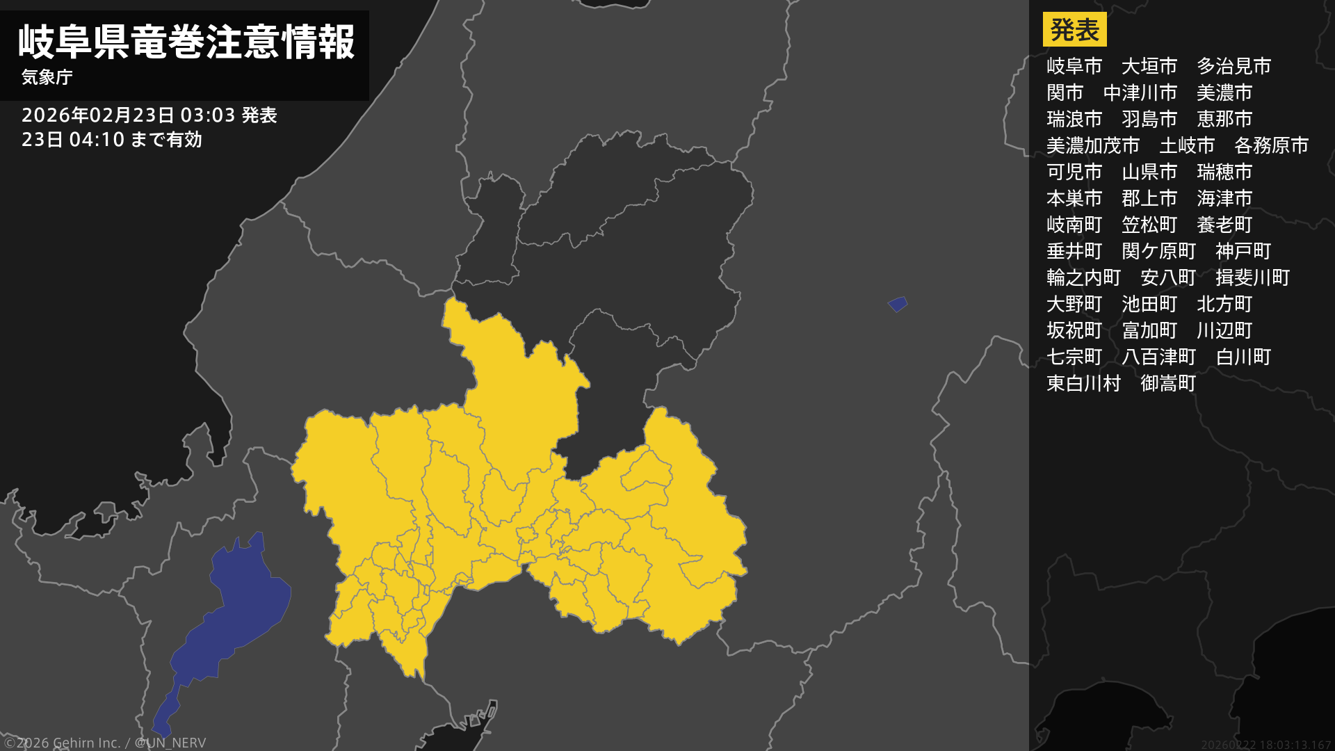 岐阜県は、竜巻などの激しい突風が発生しやすい気象状況になっています。頑丈な建物内に移動するなど安全確保に努めてください。この情報は23日04:10まで有効です。