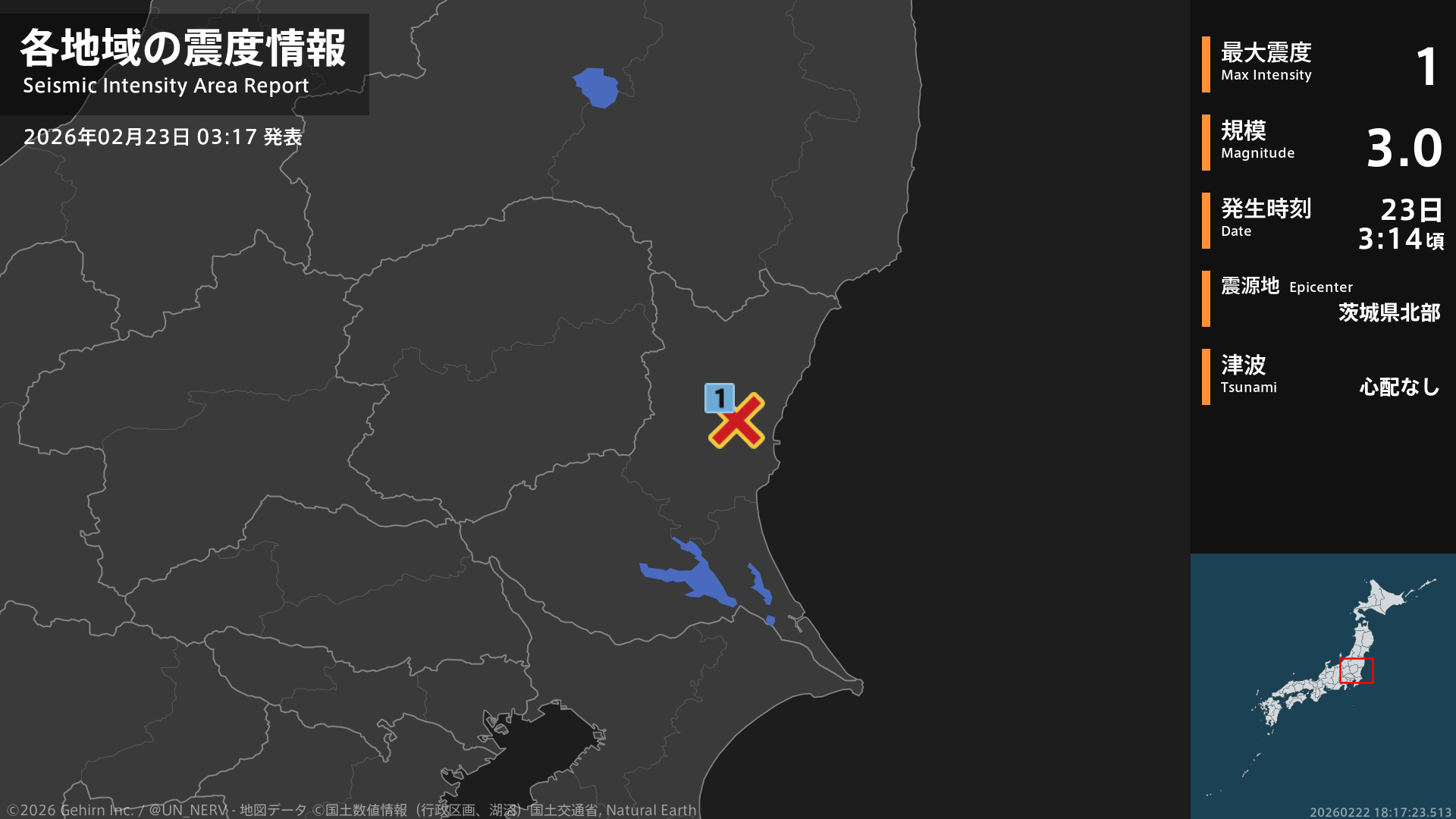 3時14分頃、茨城県北部を震源とする地震がありました。震源の深さは約60km、地震の規模はM3.0、最大震度1を茨城県で観測しています。この地震による津波の心配はありません。