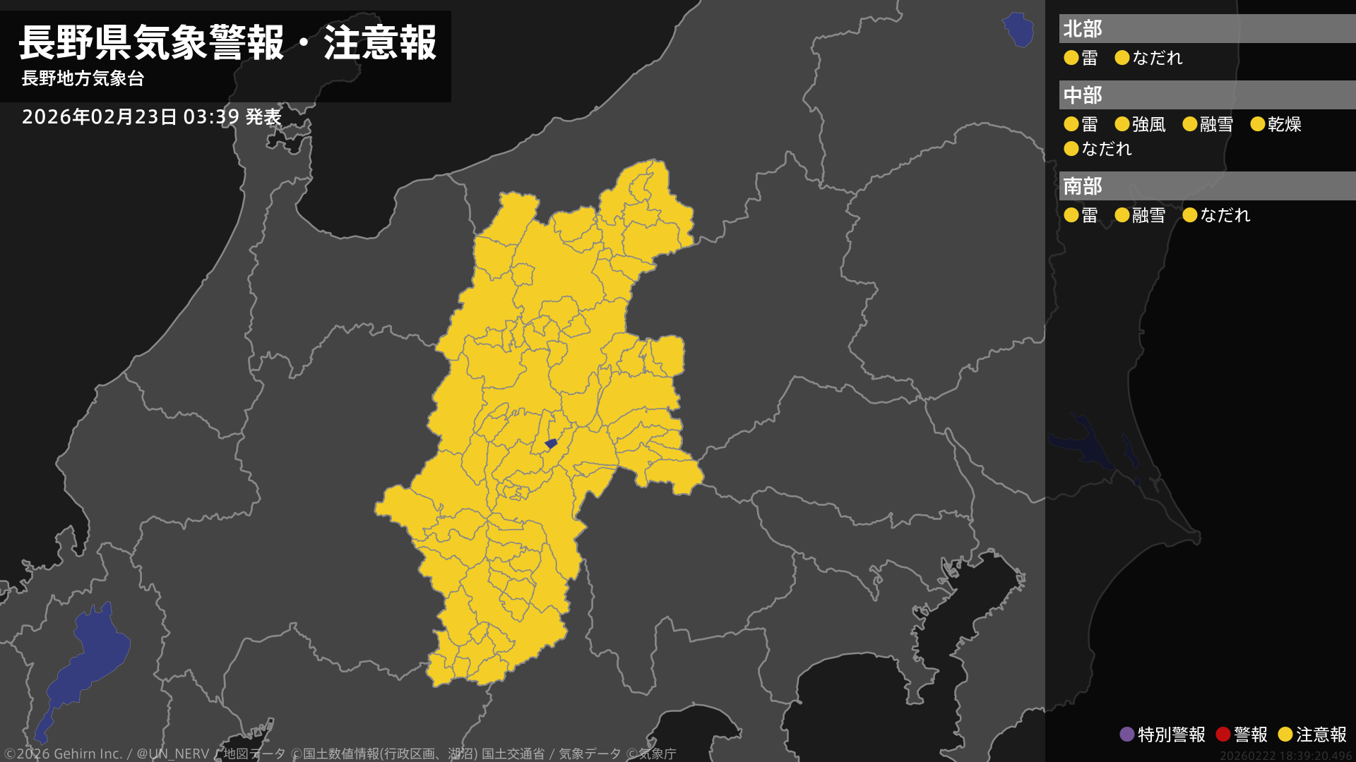 【長野県 気象警報・注意報 2026年02月23日 03:39】