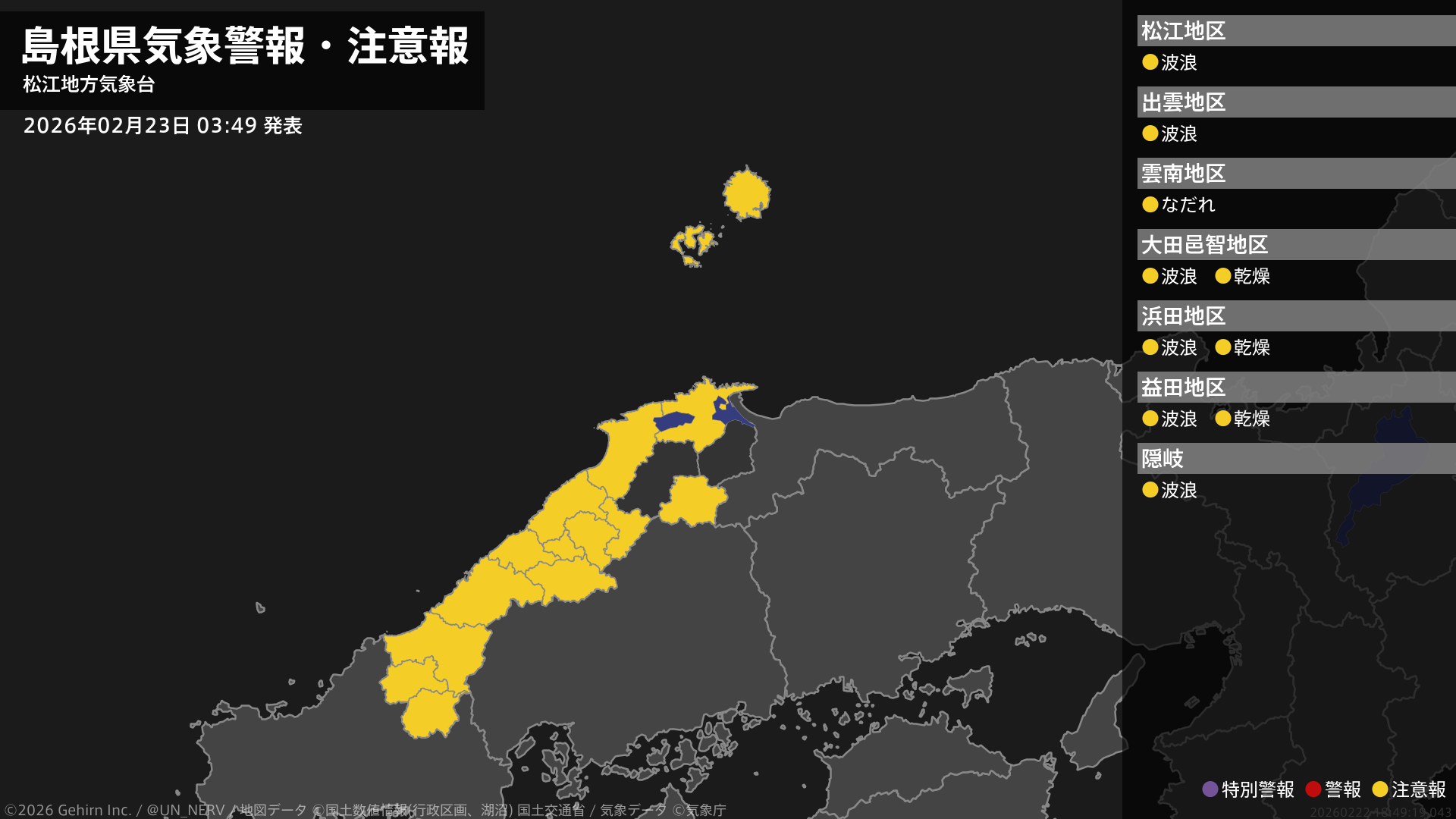【島根県 気象警報・注意報 2026年02月23日 03:49】