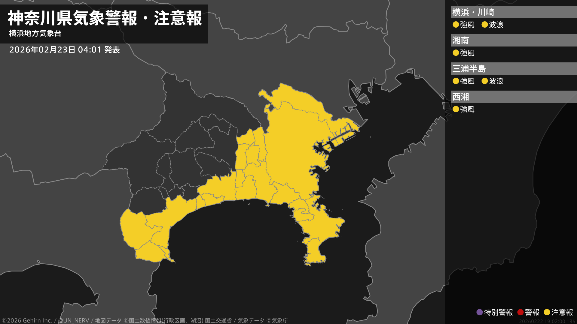 【神奈川県 気象警報・注意報 2026年02月23日 04:02】
