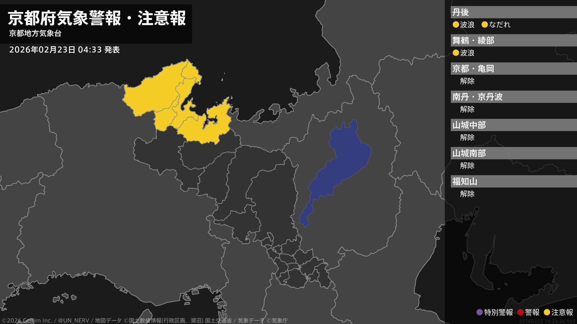 【京都府 気象警報・注意報 2026年02月23日 04:33】北部では、23日夕方まで高波に、24日までなだれに注意してください。#気象警報注意報 #京都府