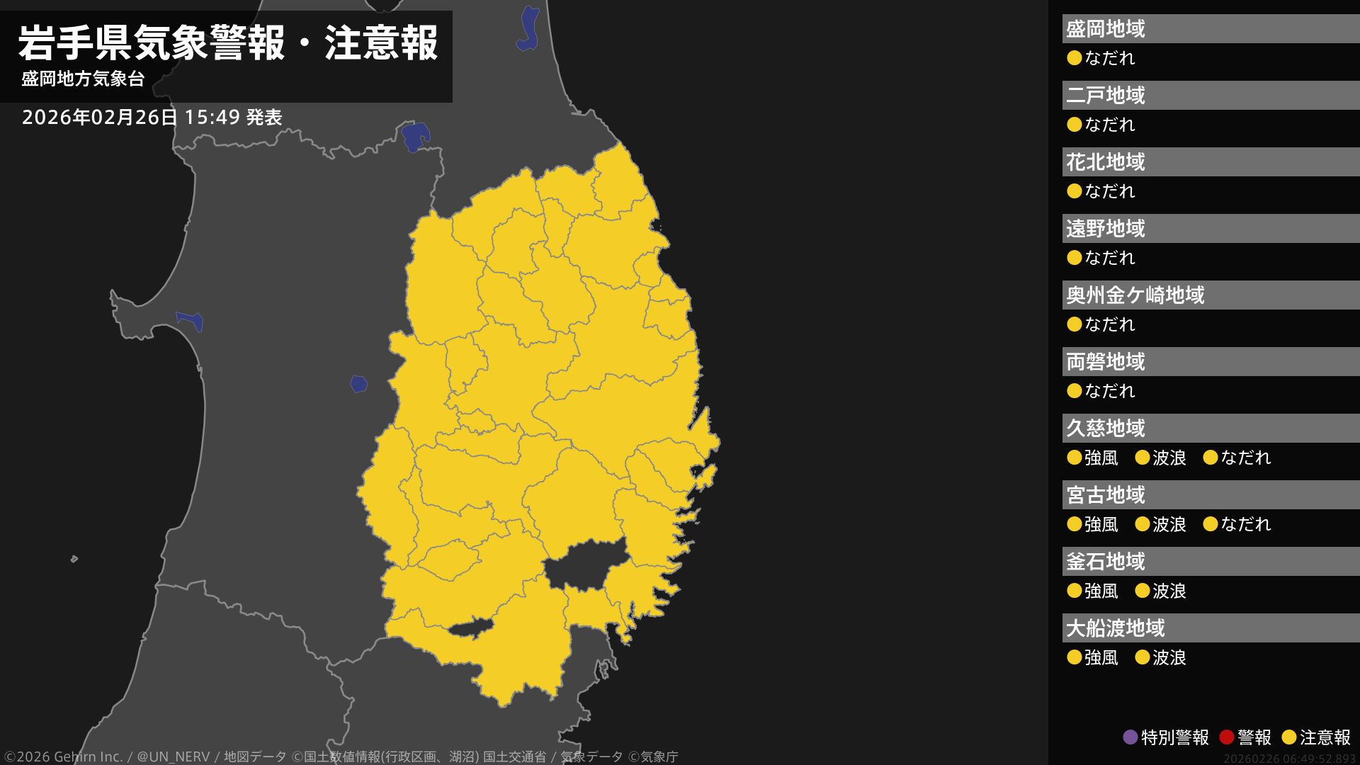 【岩手県 気象警報・注意報 2026年02月26日 15:49】
