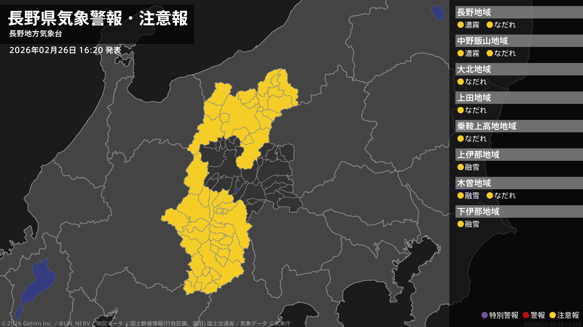 【長野県 気象警報・注意報 2026年02月26日 16:20】南部では、融雪による土砂災害に注意してください。北部では、濃霧による視程障害に注意してください。長野県では、なだれに注意してください。#気象警報注意報 #長野県