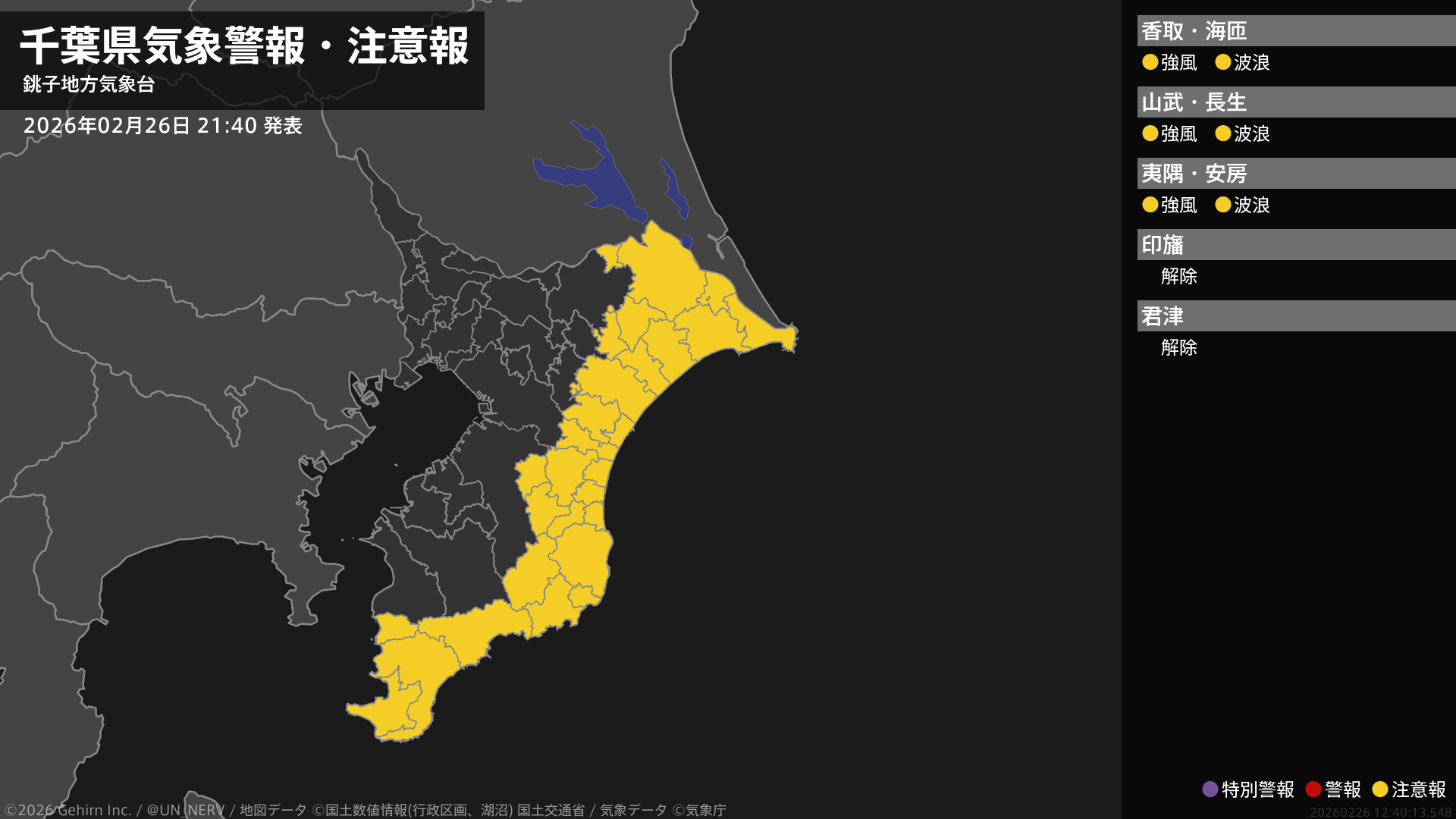 【千葉県 気象警報・注意報 2026年02月26日 21:40】北東部、南部では、強風や高波に注意してください。#気象警報注意報 #千葉県
