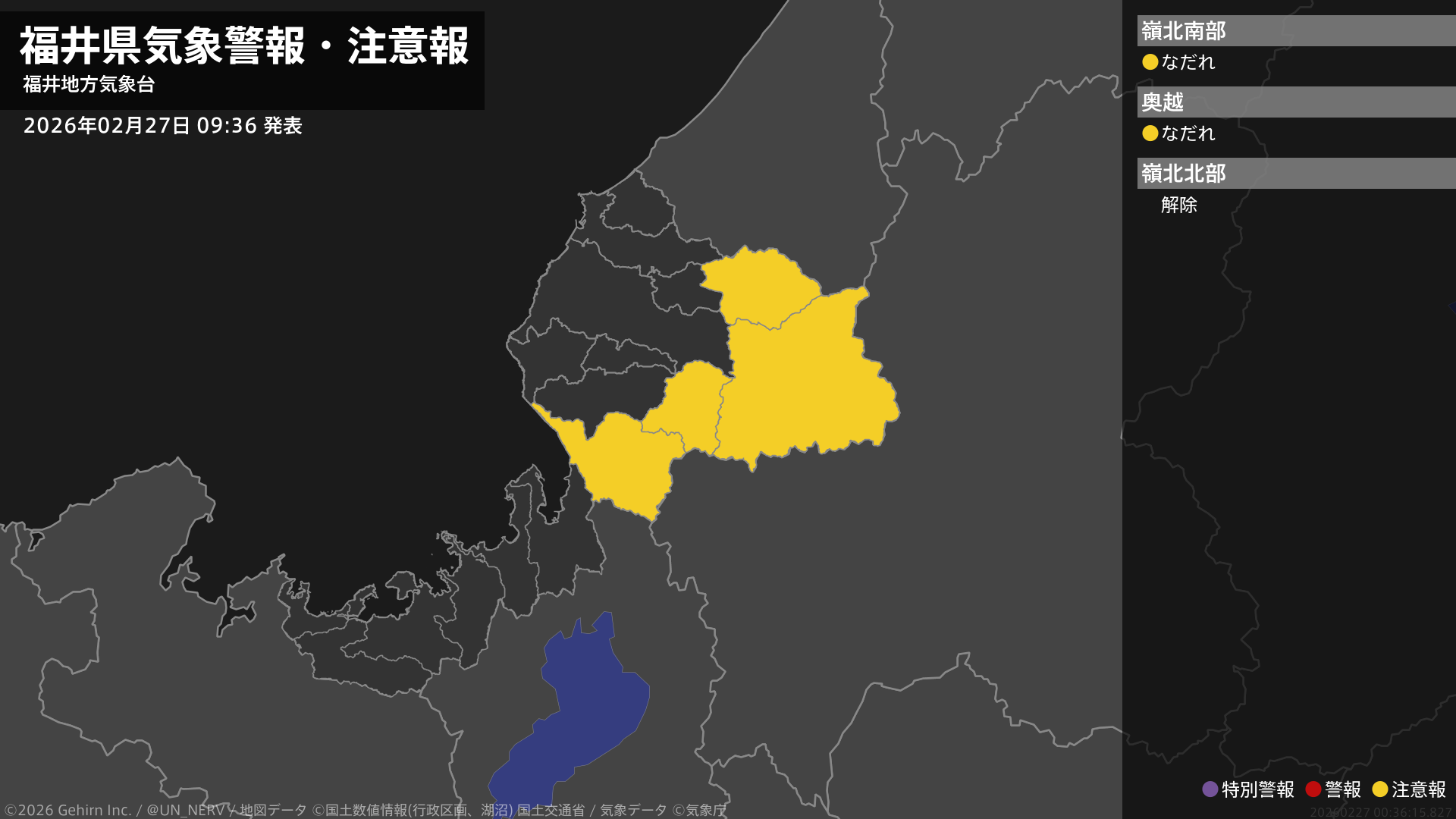【福井県 気象警報・注意報 2026年02月27日 09:36】嶺北では、1日までなだれに注意してください。#気象警報注意報 #福井県