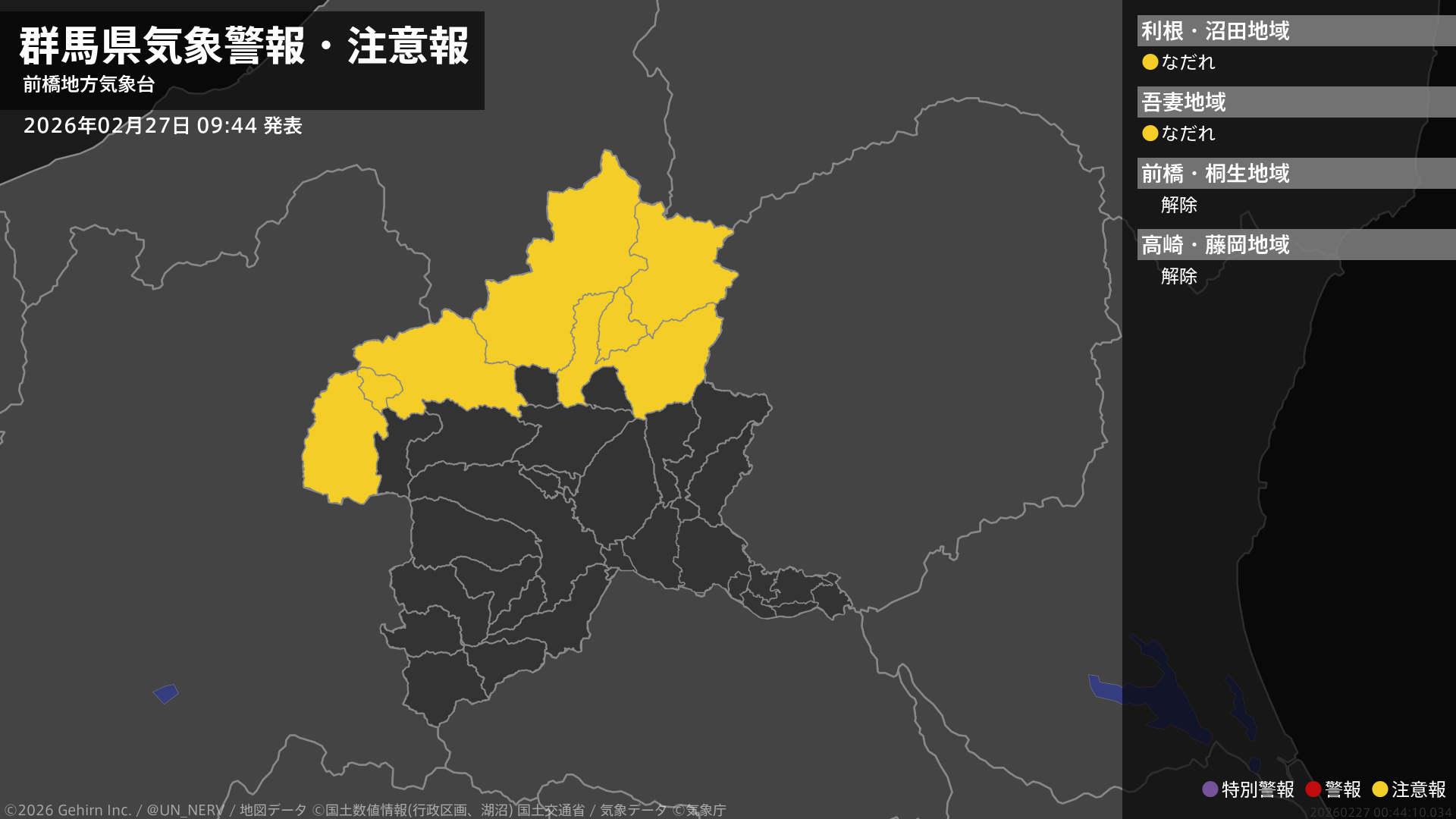 【群馬県 気象警報・注意報 2026年02月27日 09:44】北部では、28日までなだれに注意してください。#気象警報注意報 #群馬県