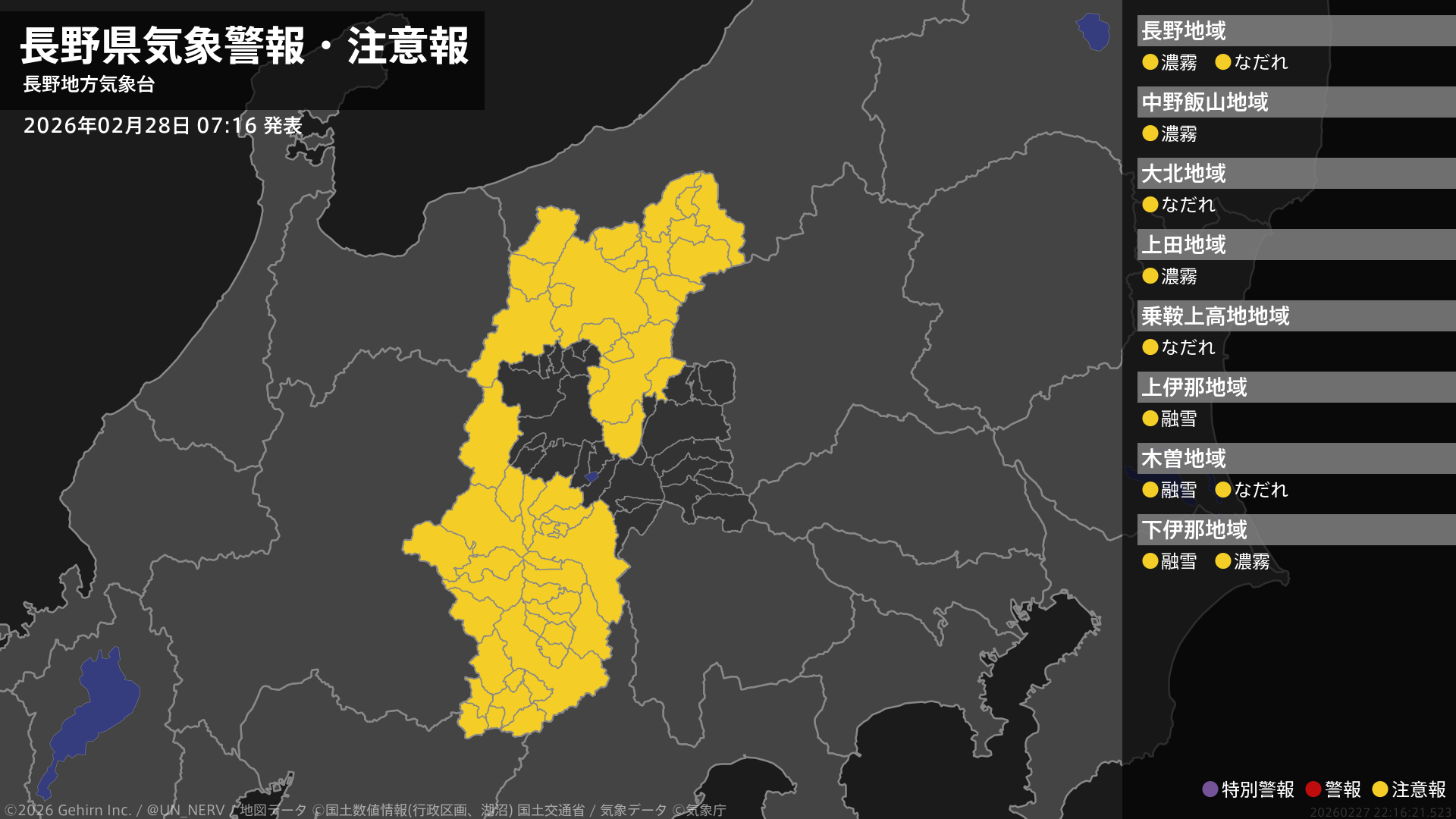 【長野県 気象警報・注意報 2026年02月28日 07:16】