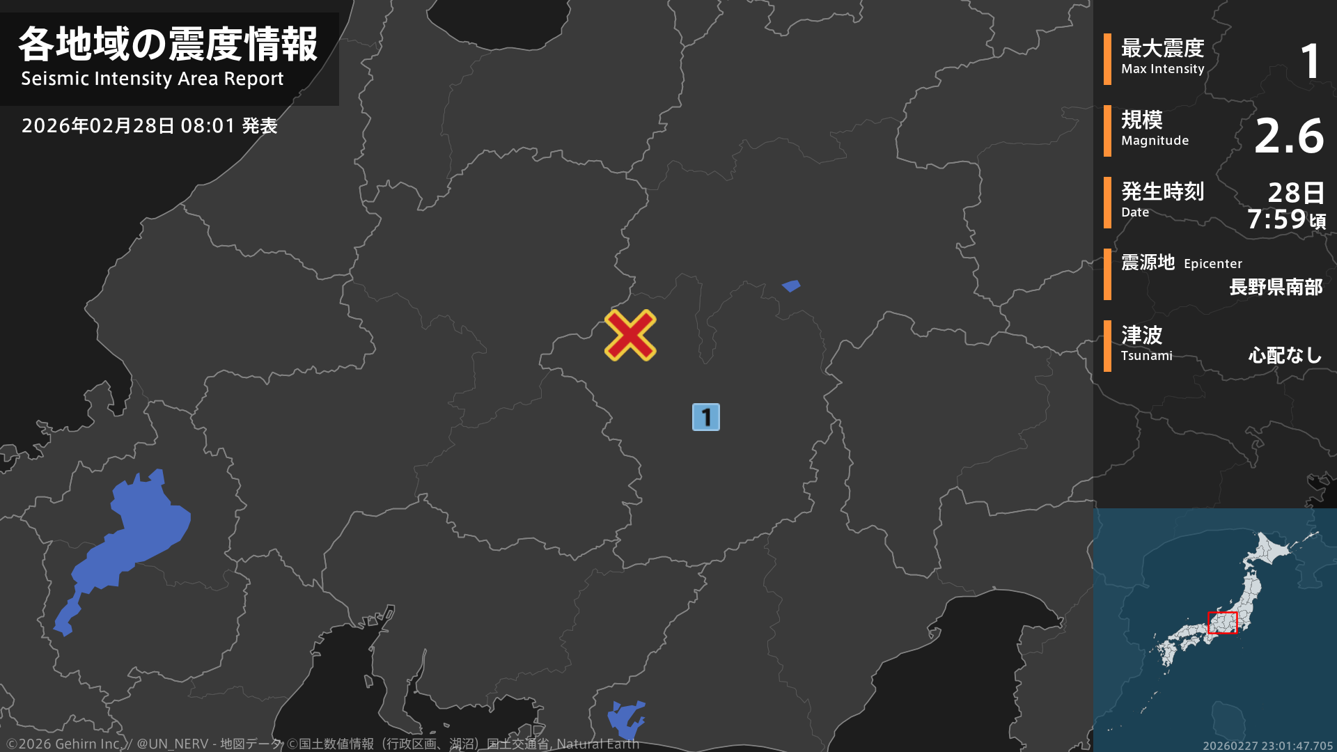 【地震情報 2026年2月28日】7時59分頃、長野県南部を震源とする地震がありました。震源の深さは約10km、地震の規模はM2.6、最大震度1を長野県で観測しています。この地震による津波の心配はありません。#地震 #長野県