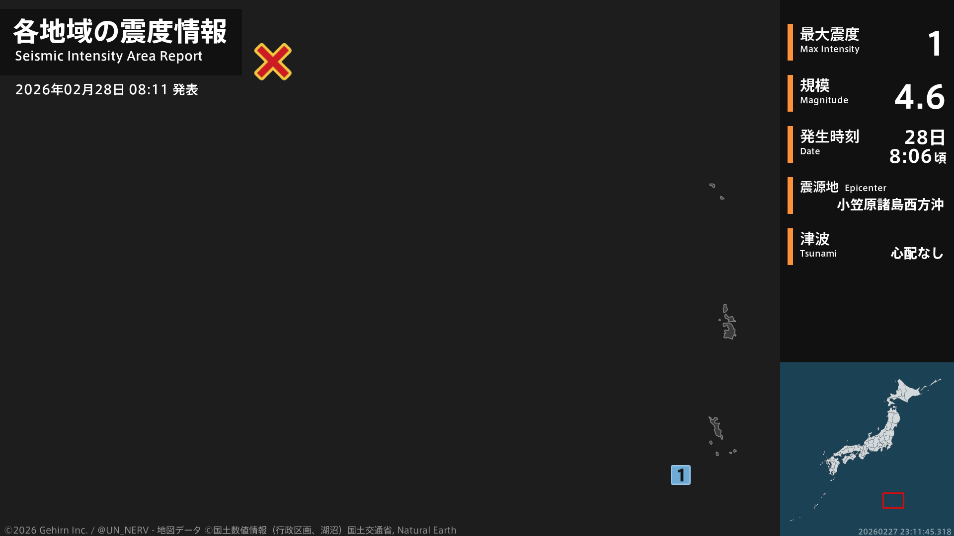【地震情報 2026年2月28日】8時6分頃、小笠原諸島西方沖を震源とする地震がありました。震源の深さは約440km、地震の規模はM4.6、最大震度1を東京都で観測しています。この地震による津波の心配はありません。#地震 #東京都