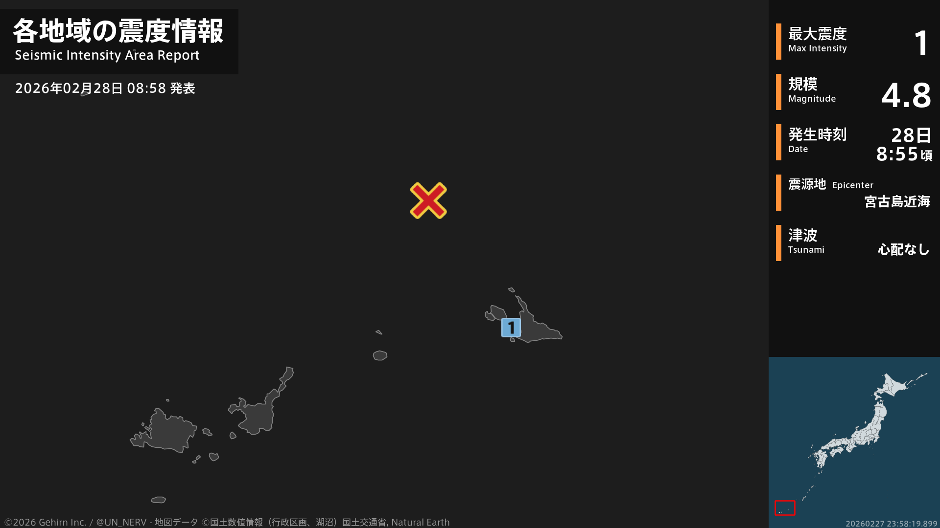 【地震情報 2026年2月28日】8時55分頃、宮古島近海を震源とする地震がありました。震源の深さは約10km、地震の規模はM4.8、最大震度1を沖縄県で観測しています。この地震による津波の心配はありません。#地震 #沖縄県