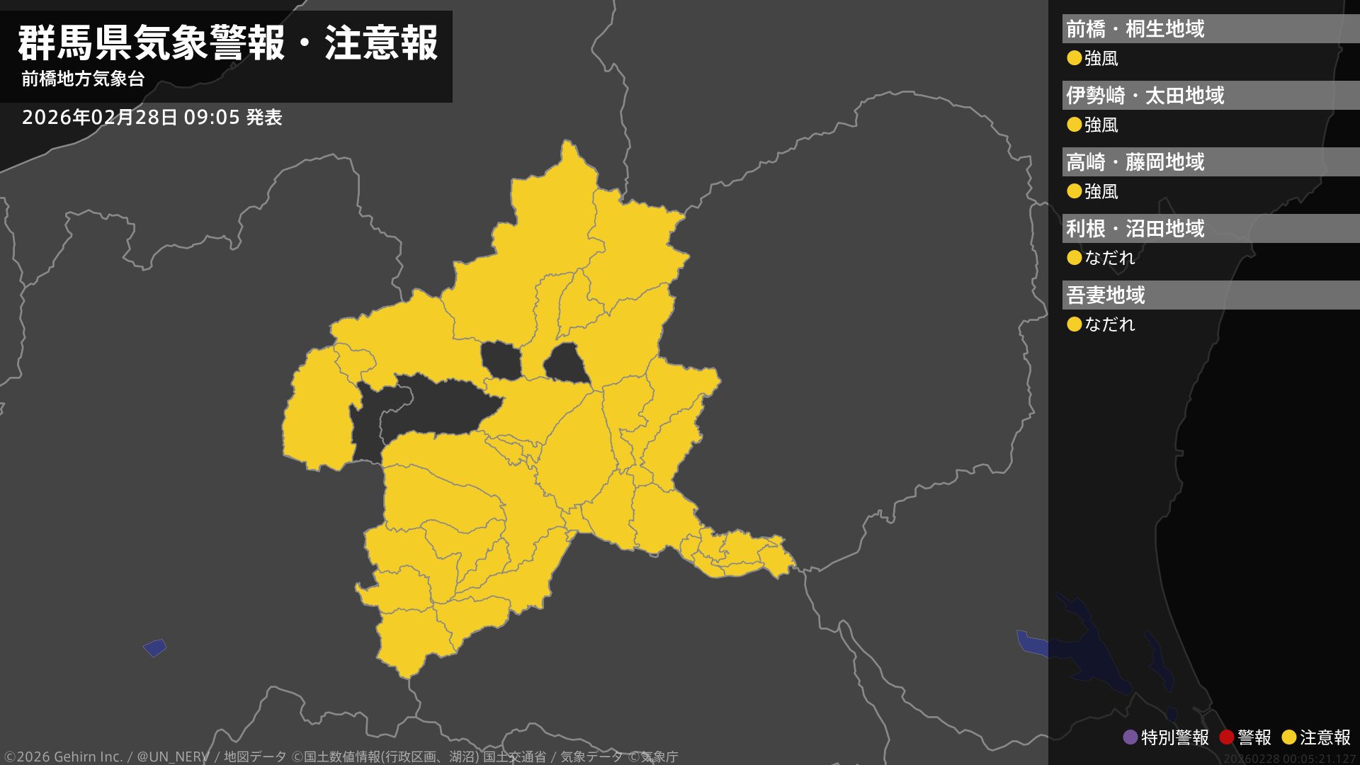 【群馬県 気象警報・注意報 2026年02月28日 09:05】南部では、28日夜のはじめ頃まで強風に注意してください。北部では、28日までなだれに注意してください。#気象警報注意報 #群馬県