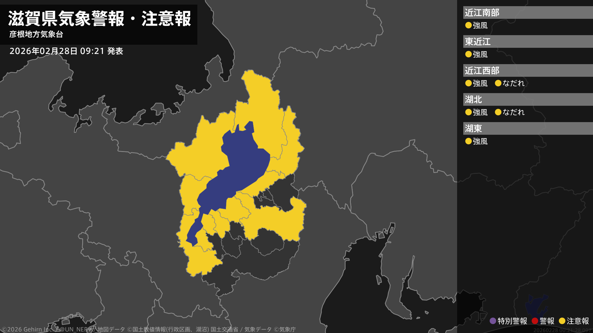 【滋賀県 気象警報・注意報 2026年02月28日 09:21】滋賀県では、1日明け方まで強風に注意してください。北部では、2日までなだれに注意してください。#気象警報注意報 #滋賀県