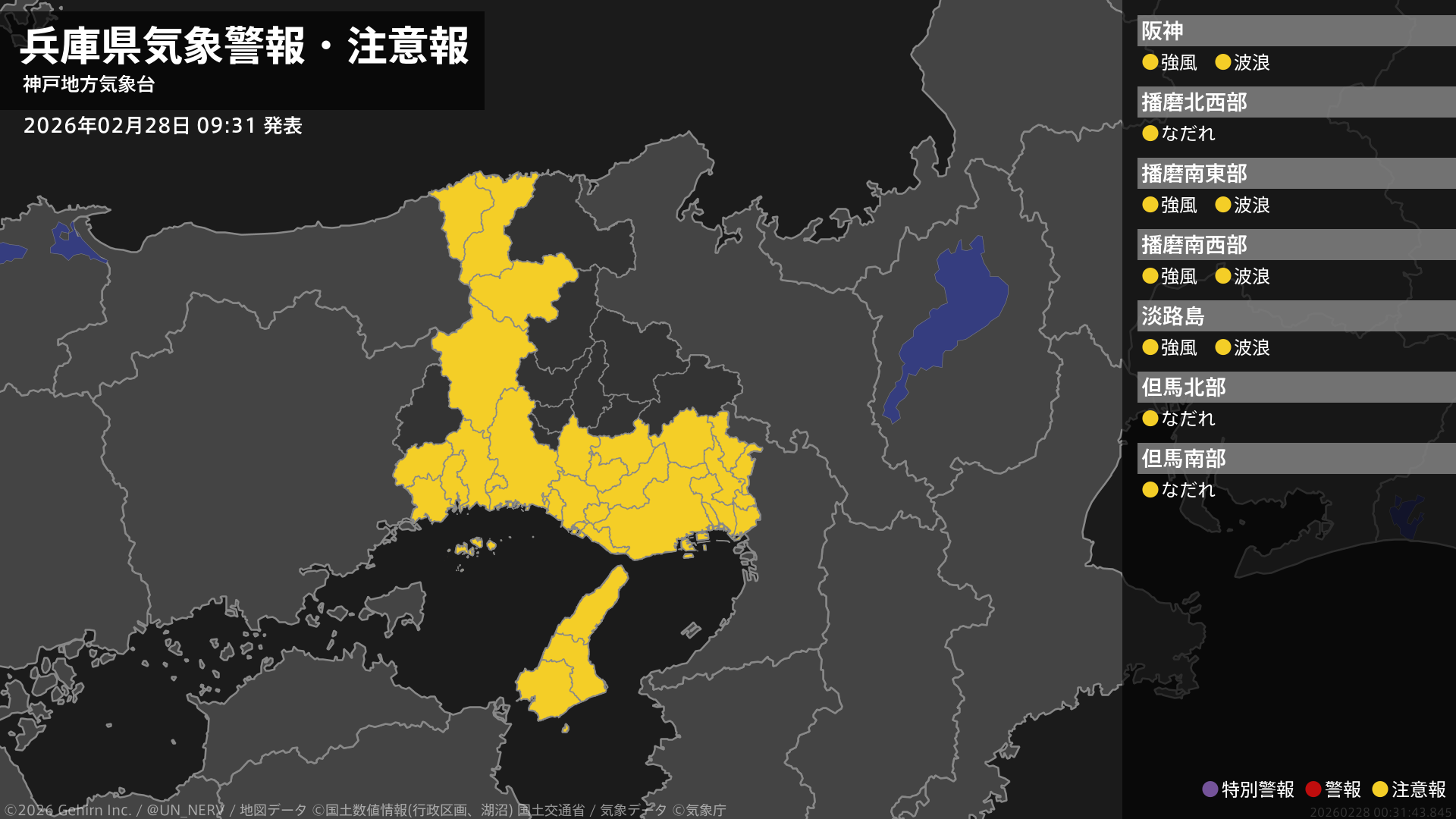【兵庫県 気象警報・注意報 2026年02月28日 09:31】南部では、28日昼過ぎから28日夜のはじめ頃まで強風に、28日昼過ぎから1日明け方まで高波に注意してください。兵庫県では、2日までなだれに注意してください。#気象警報注意報 #兵庫県
