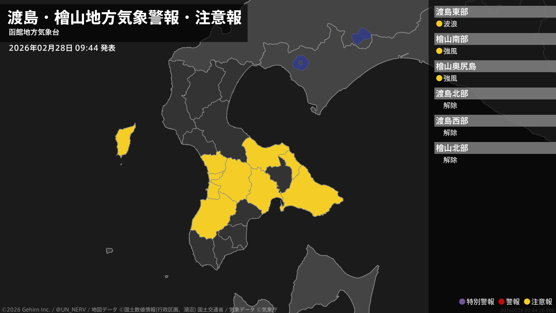 【渡島・檜山地方 気象警報・注意報 2026年02月28日 09:44】檜山地方では、28日夕方から強風に注意してください。渡島地方では、28日夕方まで高波に注意してください。#気象警報注意報 #渡島地方 #檜山地方