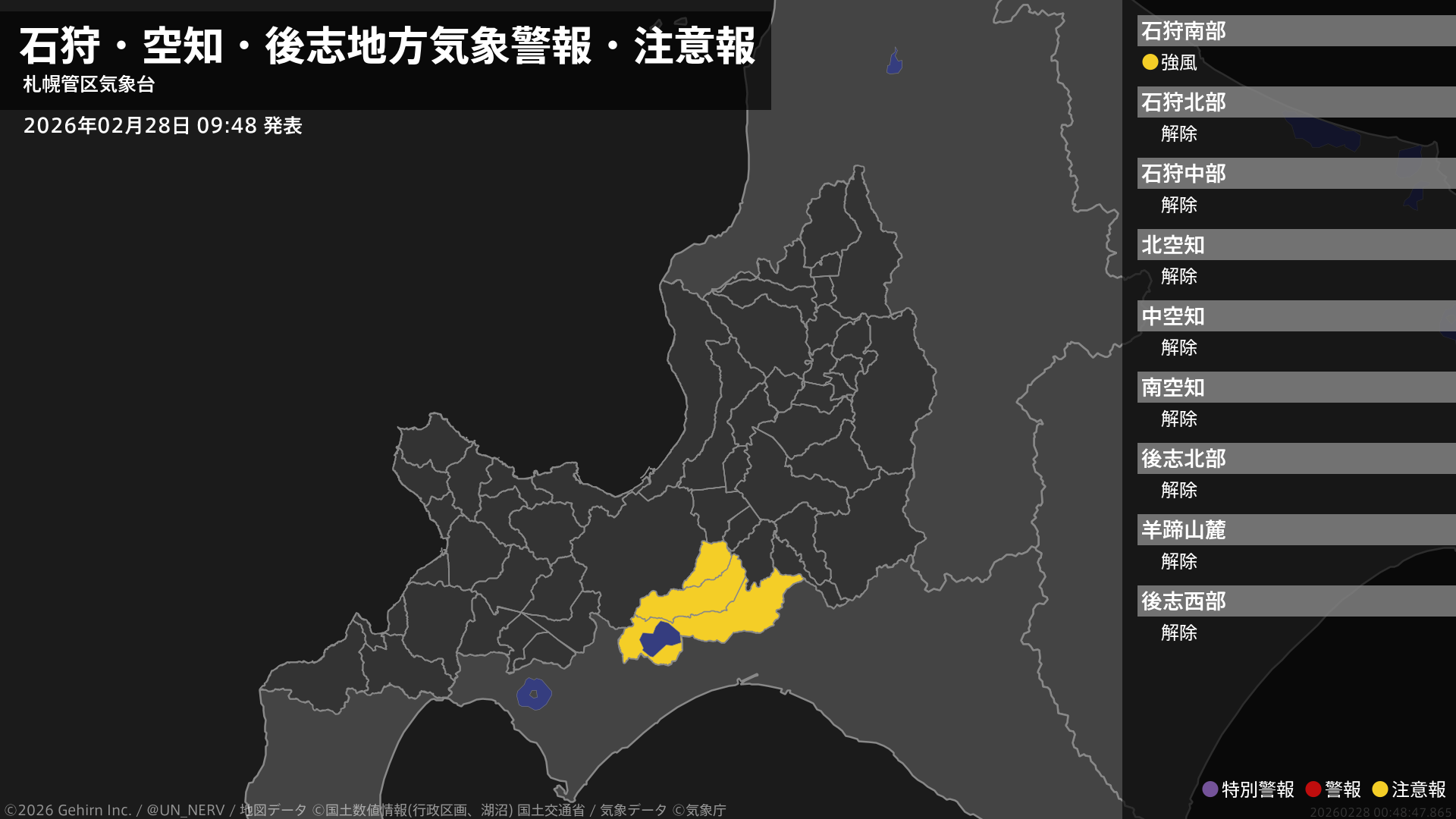 【石狩・空知・後志地方 気象警報・注意報 2026年02月28日 09:48】石狩地方では、28日夕方から1日明け方まで強風に注意してください。#気象警報注意報 #石狩地方 #空知地方 #後志地方