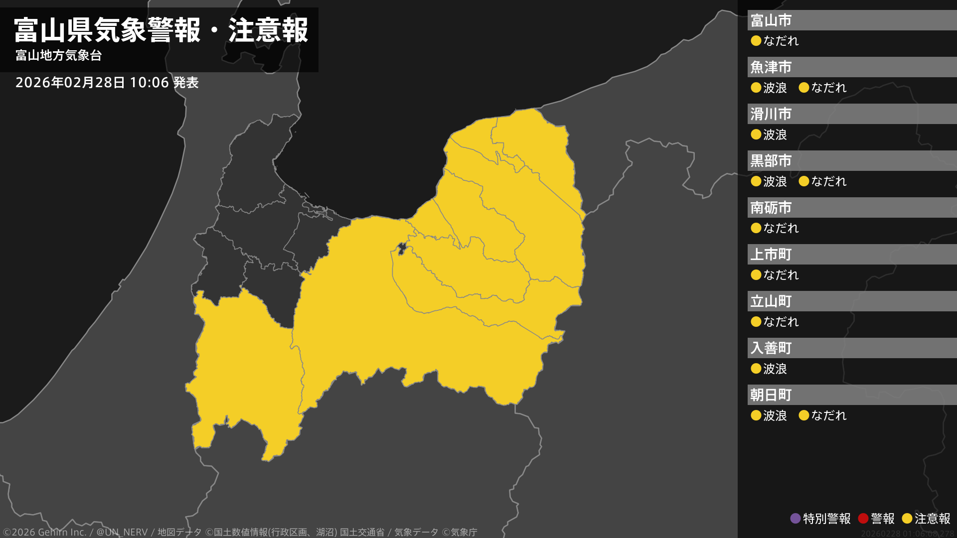 【富山県 気象警報・注意報 2026年02月28日 10:06】東部では、28日夕方から1日明け方まで高波に注意してください。富山県では、28日までなだれに注意してください。#気象警報注意報 #富山県