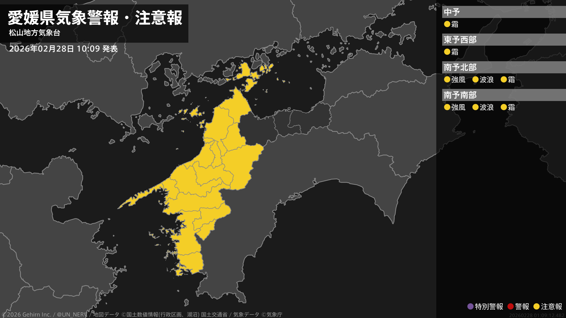 【愛媛県 気象警報・注意報 2026年02月28日 10:09】南予では、1日明け方まで強風や高波に注意してください。愛媛県では、1日朝は霜に対する農作物の管理に注意してください。#気象警報注意報 #愛媛県
