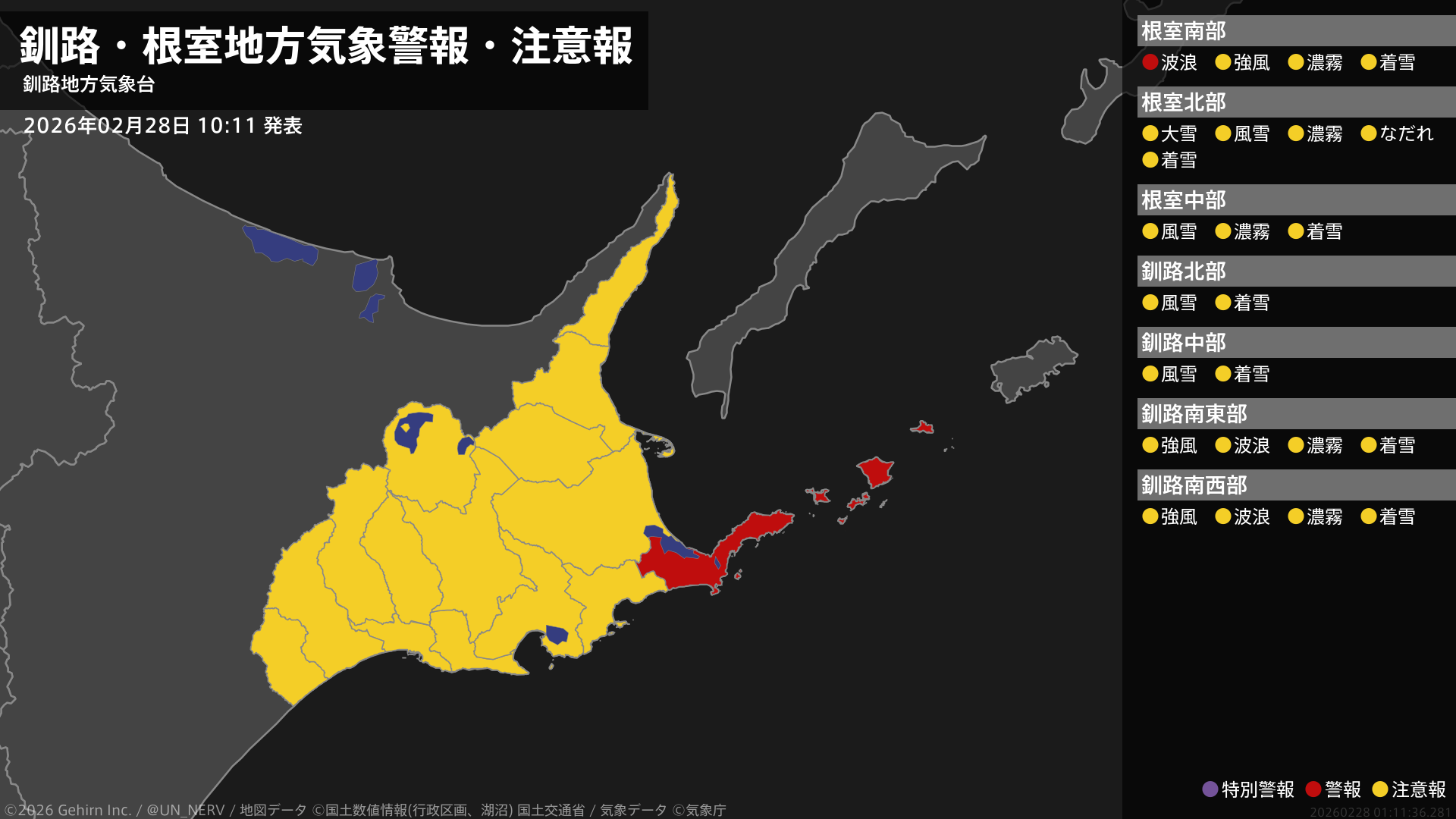 【釧路・根室地方 気象警報・注意報 2026年02月28日 10:11】根室地方では、28日夕方まで高波に警戒してください。#気象警報注意報 #根室地方 #釧路地方