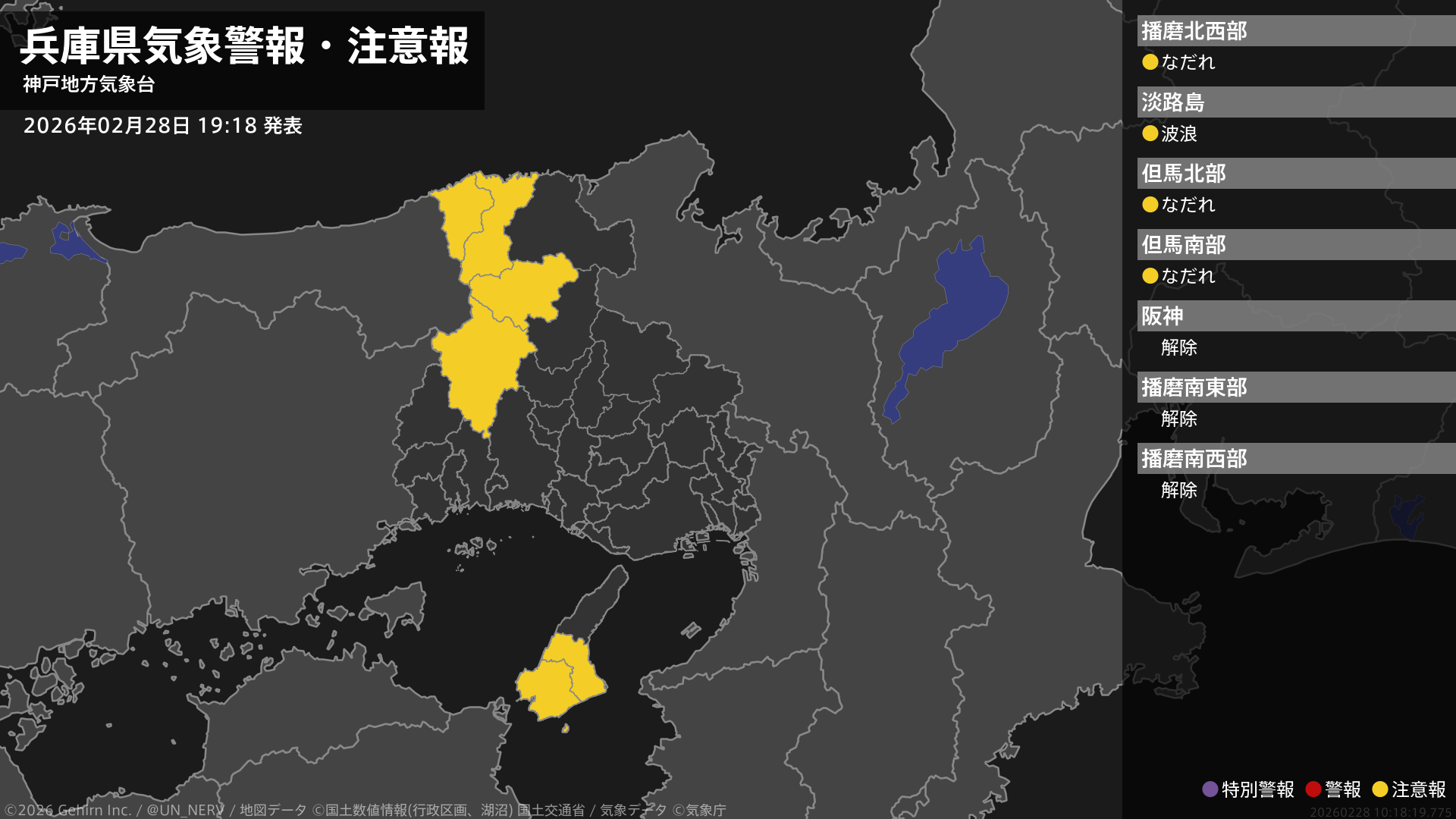 【兵庫県 気象警報・注意報 2026年02月28日 19:18】