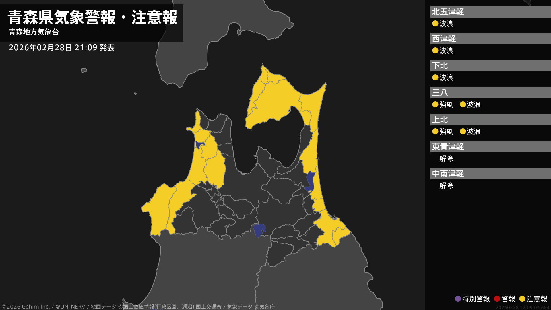 【青森県 気象警報・注意報 2026年02月28日 21:09】