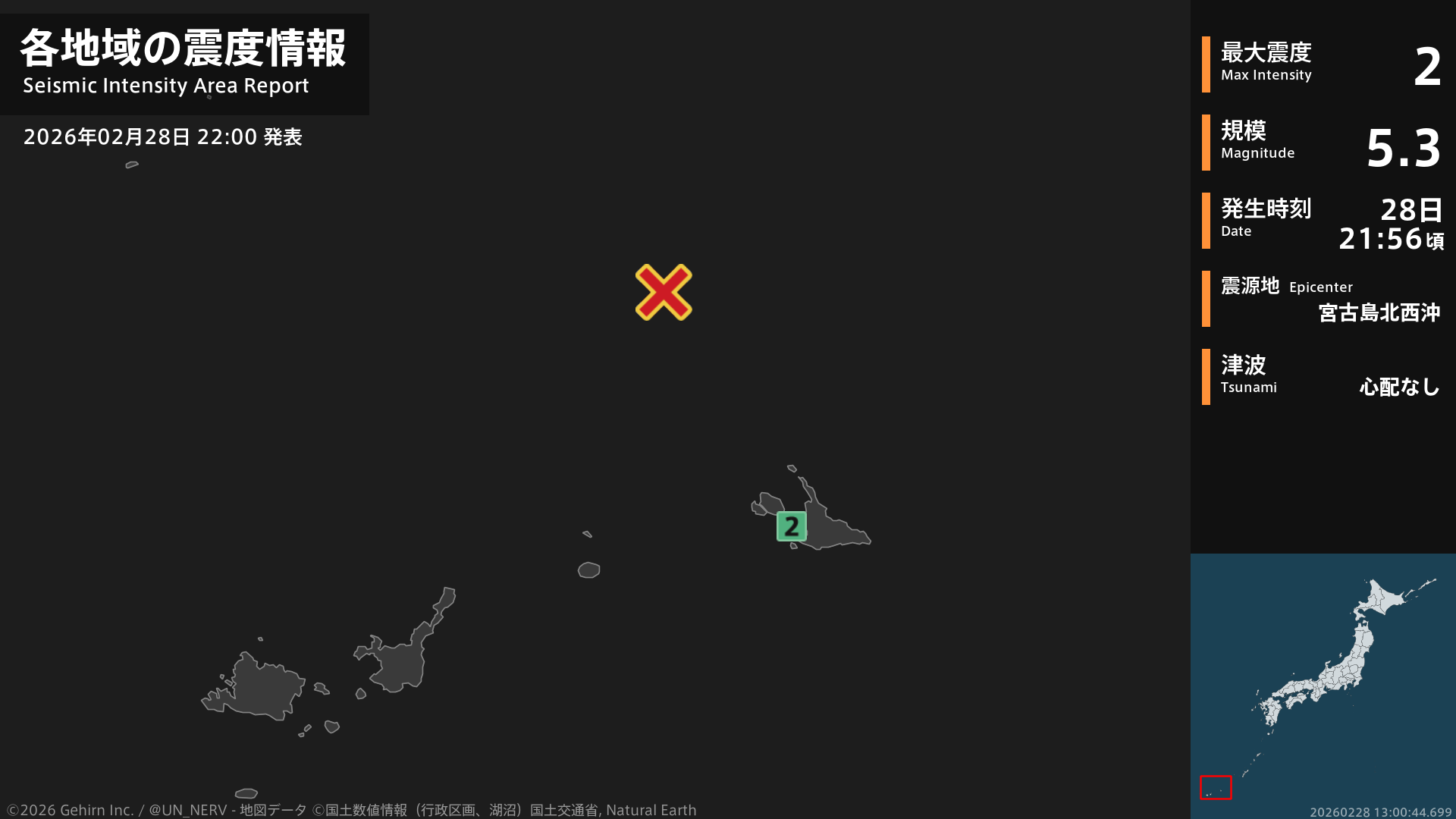 21時56分頃、宮古島北西沖を震源とする地震がありました。震源の深さは約10km、地震の規模はM5.3、最大震度2を沖縄県で観測しています。この地震による津波の心配はありません。