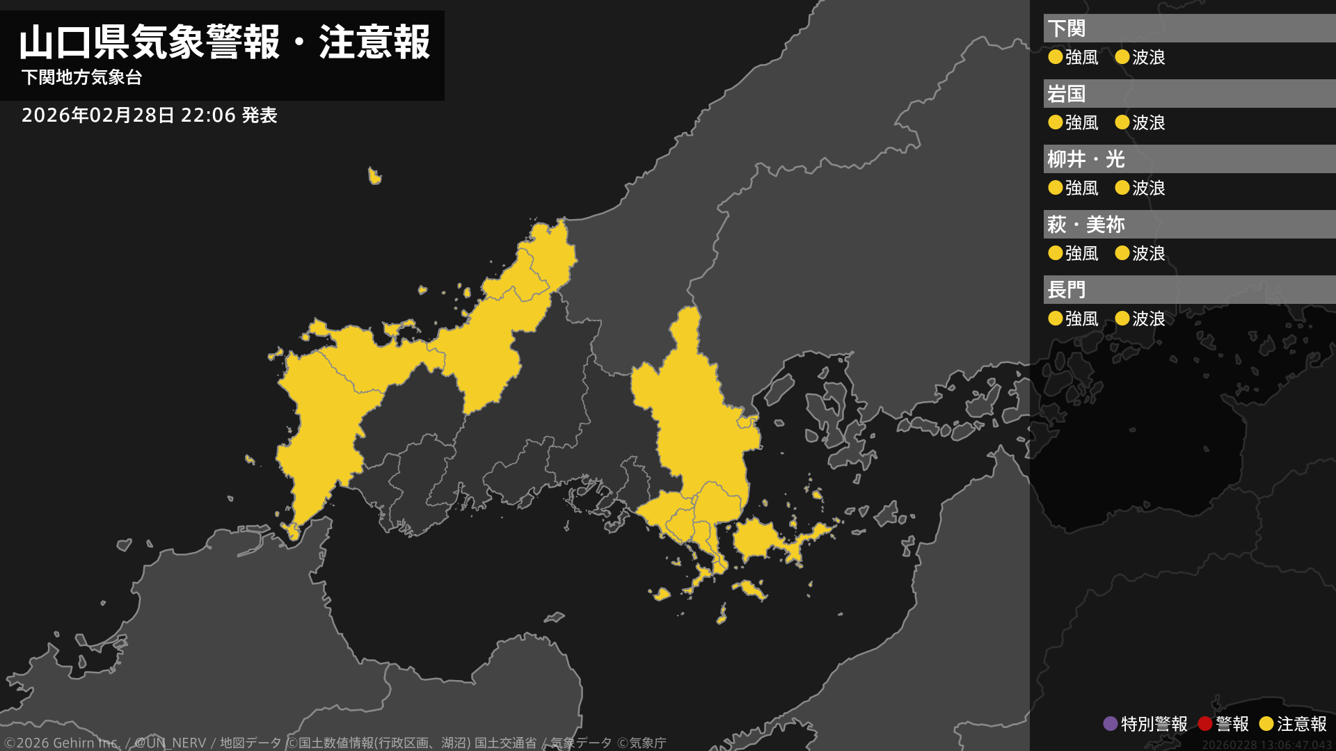 【山口県 気象警報・注意報 2026年02月28日 22:06】