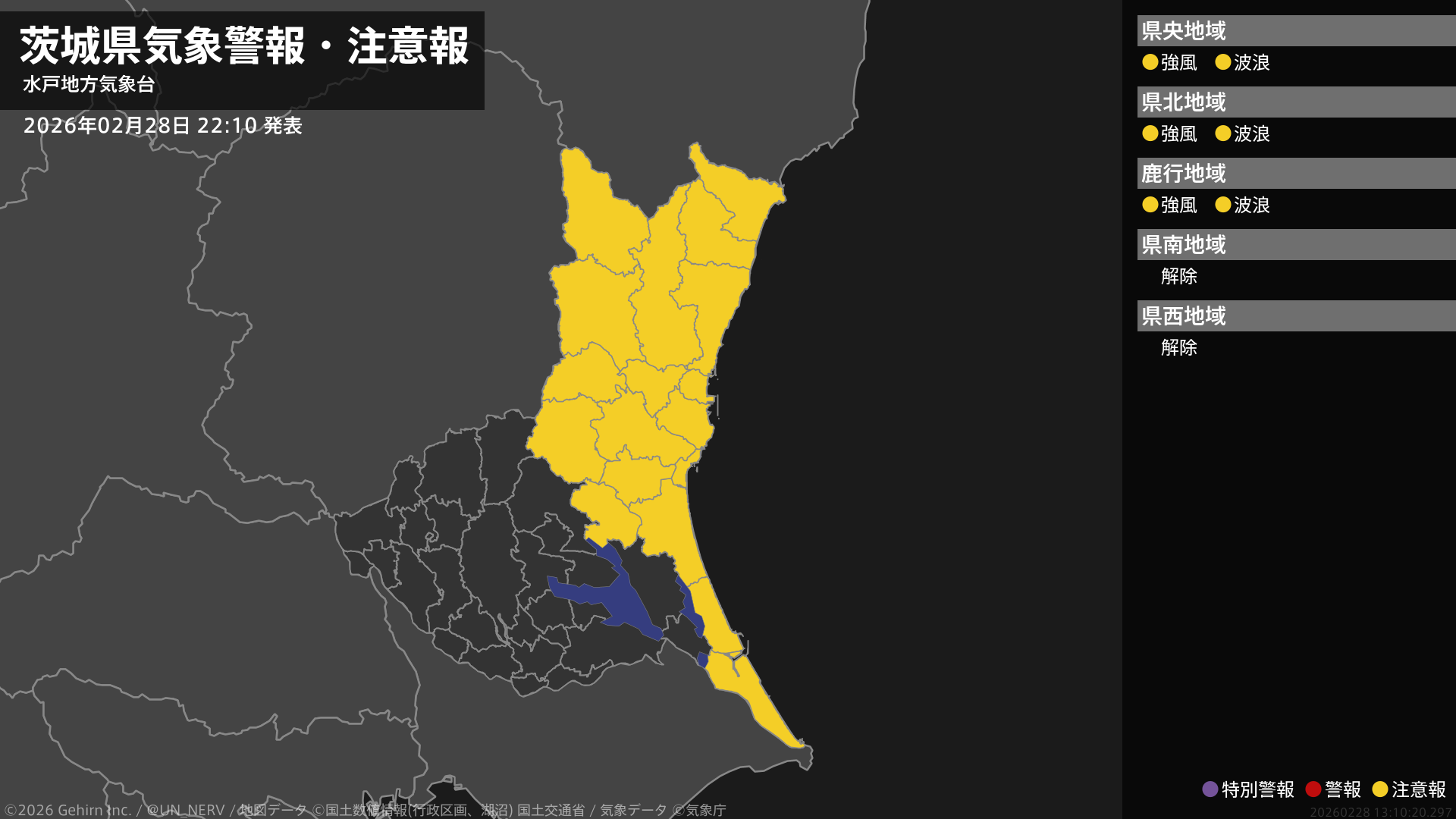 【茨城県 気象警報・注意報 2026年02月28日 22:10】
