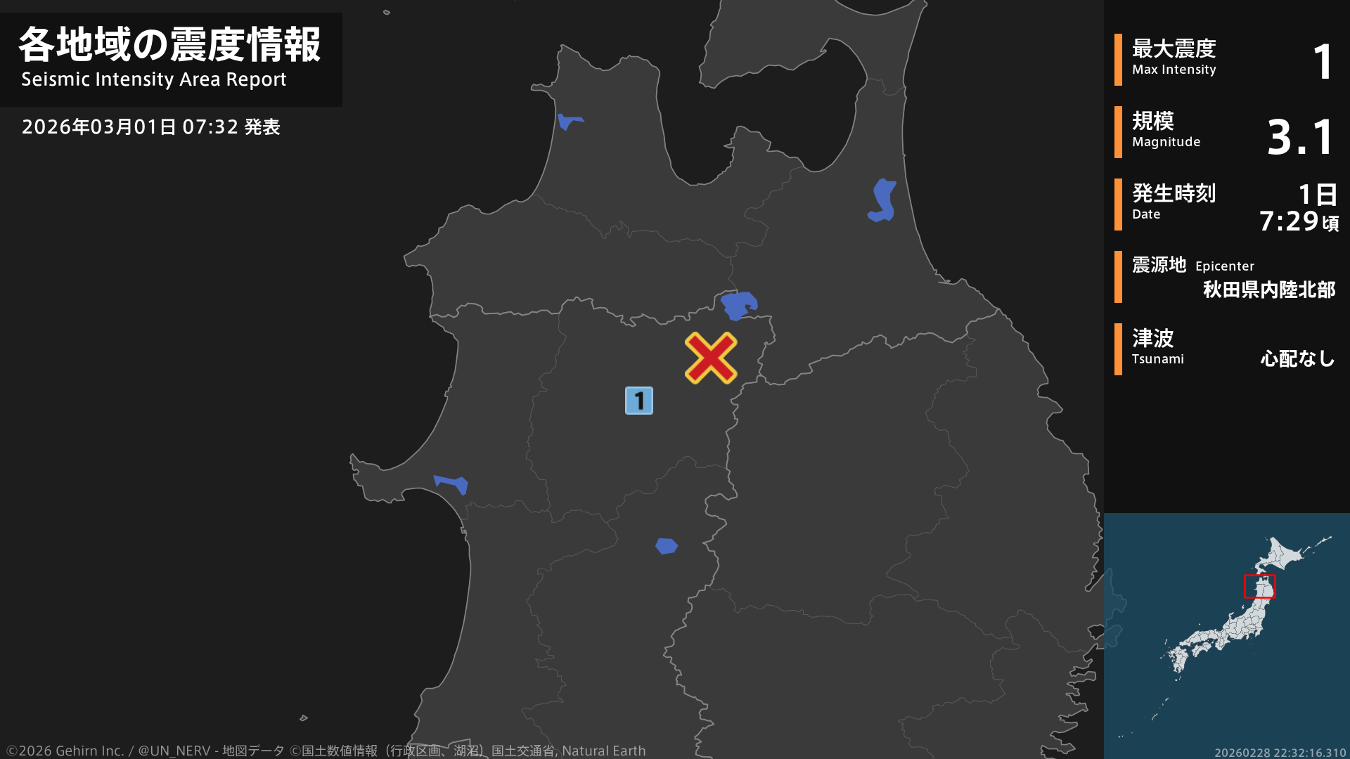 【緊急地震速報 第1報 2026年3月1日】