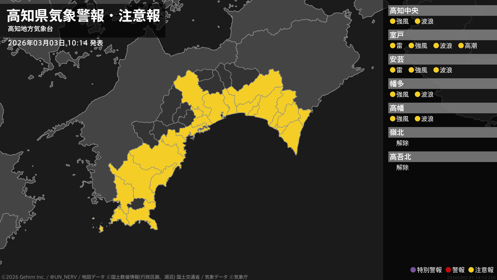 【高知県 気象警報・注意報 2026年03月03日 10:14】高知県では、強風や高波に注意してください。東部では、高潮や急な強い雨、落雷に注意してください。#気象警報注意報 #高知県