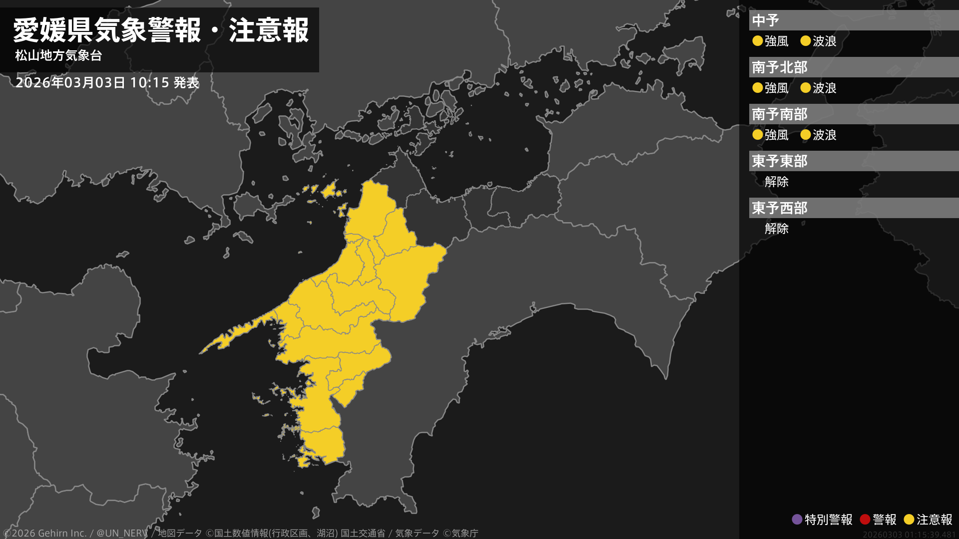 【愛媛県 気象警報・注意報 2026年03月03日 10:15】中予、南予では、強風や高波に注意してください。#気象警報注意報 #愛媛県