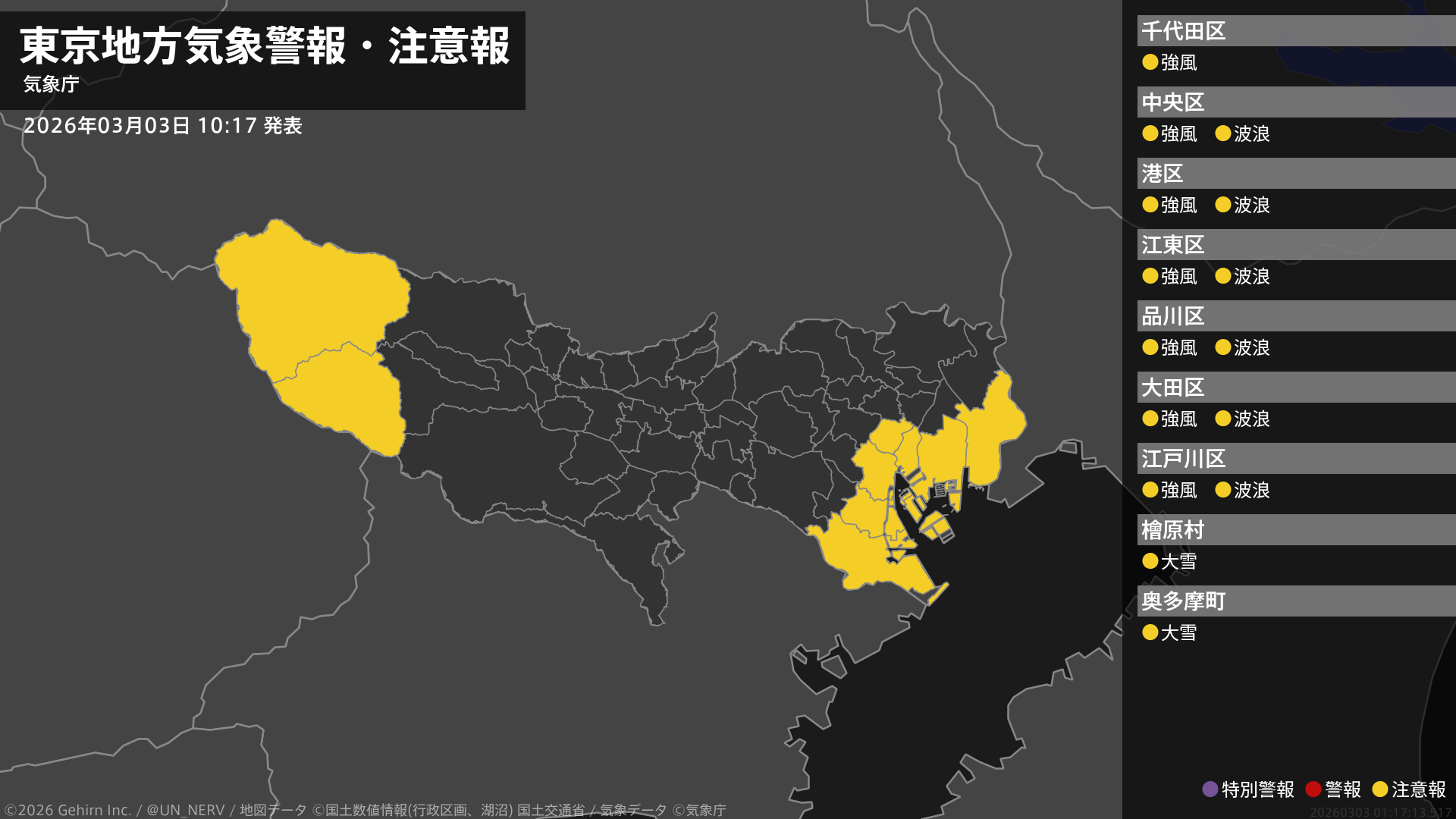 【東京都 気象警報・注意報 2026年03月03日 10:17】東京地方、伊豆諸島北部、伊豆諸島南部では強風に、東京地方では大雪に、東京都では高波に、伊豆諸島北部、伊豆諸島南部では急な強い雨や落雷に注意してください。#気象警報注意報 #東京都